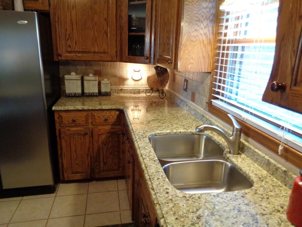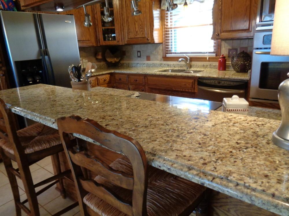 Все рабочие поверхности этой кухни выполнены из итальянского золотисто-бежевого гранита Giallo Veneziano. Этот камень, название которого переводится как "Золото Венеции" обладает выраженной зернистой текстурой в теплой гамме желтоватых оттенков.