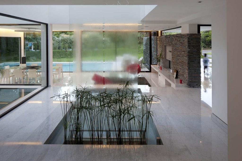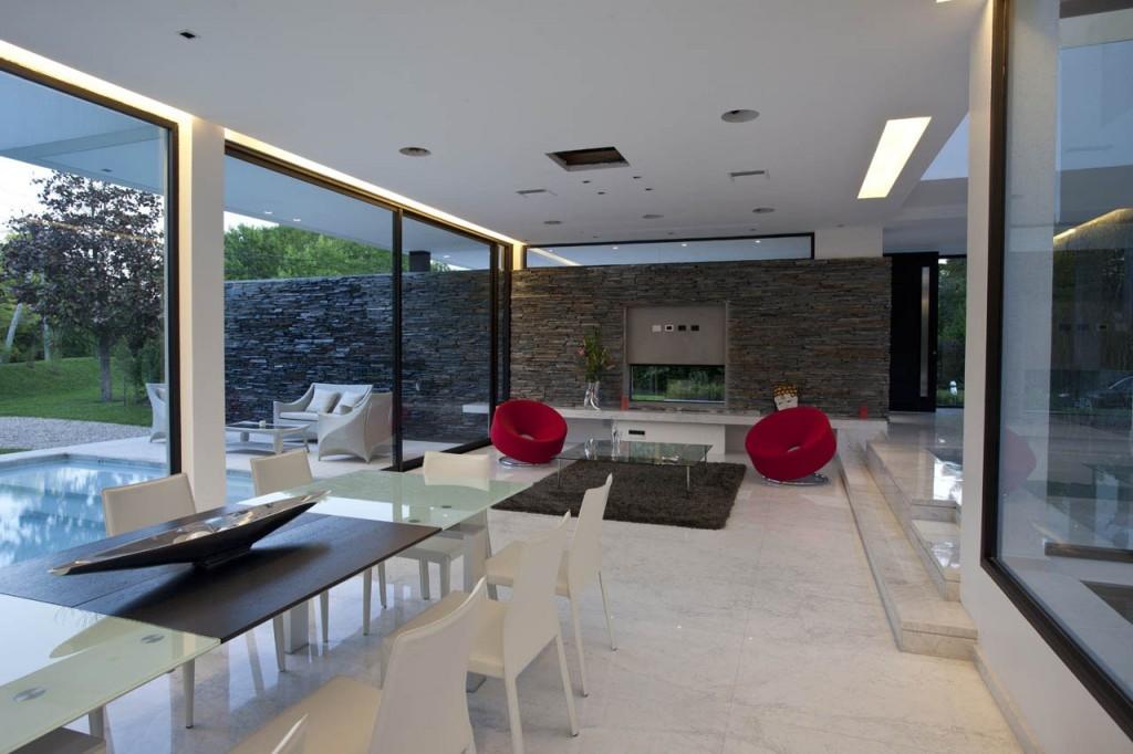 Перед нами проект сверхмодной отделки загородного дома в Аргентине. Стеклянный дом, полный света и воздуха, облицован элитными материалами. Доминирует же во всей композиции классический камень, актуальный во все времена, - каррарский мрамор Bianco Carrara Gioia. Нежно-серый, прожилковатый, мелкозернистый Bianco Carrara Gioia с полированной фактурой обладает глянцевой поверхностью. Он создает благородную и изысканную атмосферу.