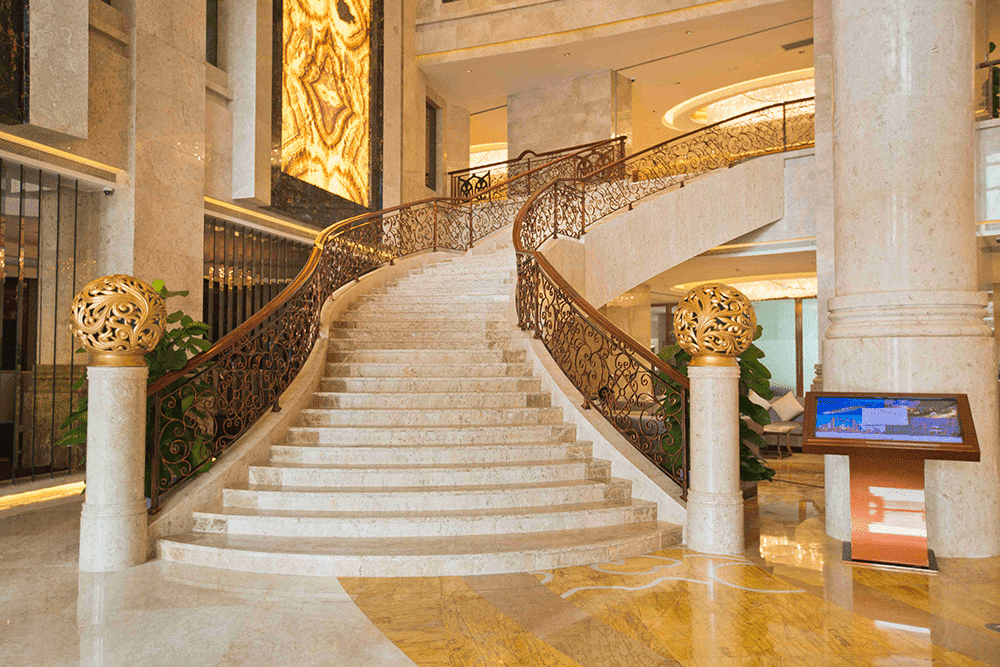 Пол фойе выложен в виде огромного панно из трех сортов мрамора: яркого желтого Amarillo Triana, светло-коричневого Brecha Rosada и бежевого Crema Marfil.