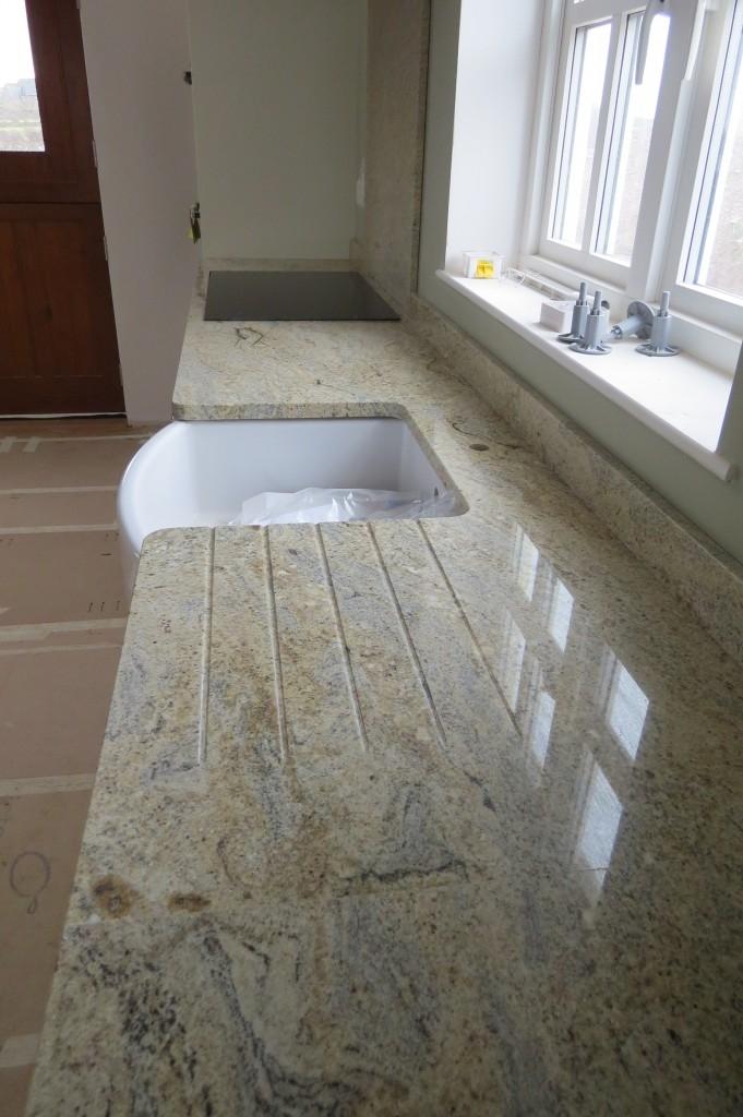 Kashmir Gold - это классический гранит в гамме светло-серых и золотистых оттенков. Он смотрится одновременно скромно и презентабельно. В полированной фактуре обозначается интересный волнообразный рисунок цветовых переходов.
