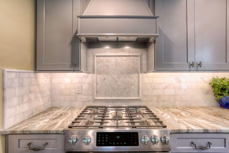 А вот зона фартука облицована мрамором, и мрамором не простым. А самым известным в мире - итальянским Bianco Carrara. Плитка светло-серого изысканного мрамора сложена в "кирпичную" кладку. У варочной поверхности фартук украшен фрагментом мозаики.