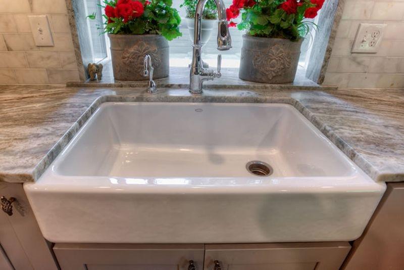 Для покрытия рабочих поверхностей был выбран серый травертин Travertine Silver с полосчатым рисунком (распиловка вдоль жилы - Vein Cut). Все столешницы вырезаны из 3-сантиметровых слэбов травертина с полированной фактурой. Поверхность столешниц раскрывает удивительную волнистую текстуру камня в серо-бежевых тонах. Также этот камень слагает подоконник и оконную раму.