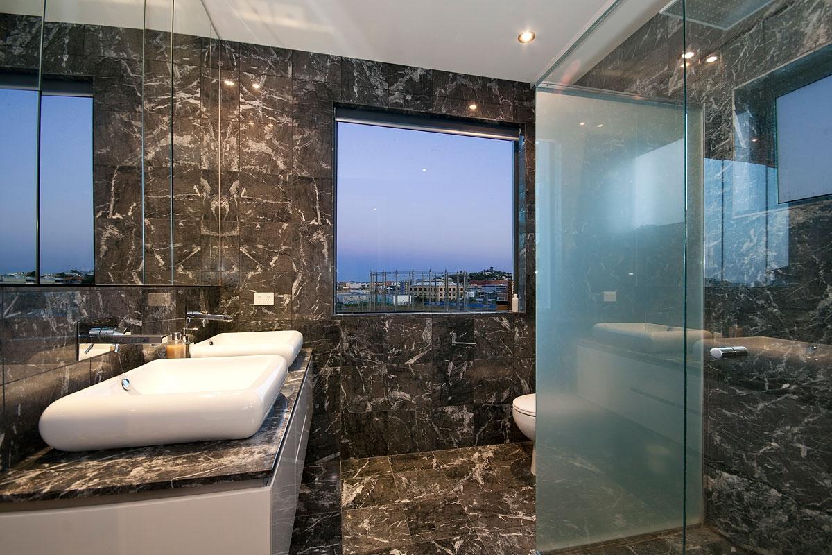 Главную роль в дизайне ванной комнаты играет мрамор Grigio Carnico. Им облицованы стены и пол, из него же изготовлена столешница для раковин. Темно-серый камень с белыми хаотичными прожилками органичен и самодостаточен.