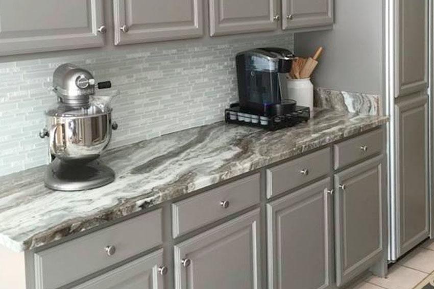 Все столешницы рабочей зоны на кухне выполнены из итальянского мрамора Arabescato Orobico Grigio. Для этого камня характерен волнистый волнующий рисунок в различных оттенках серой цветовой гаммы. Это один из самых живописных отделочных камней. Помимо своей выразительной красоты, он славится и своей универсальностью. Этот камень органичен в проектах различных стилистических направлений. Он прекрасно сочетается с большинство материалов и цветовых гамм.