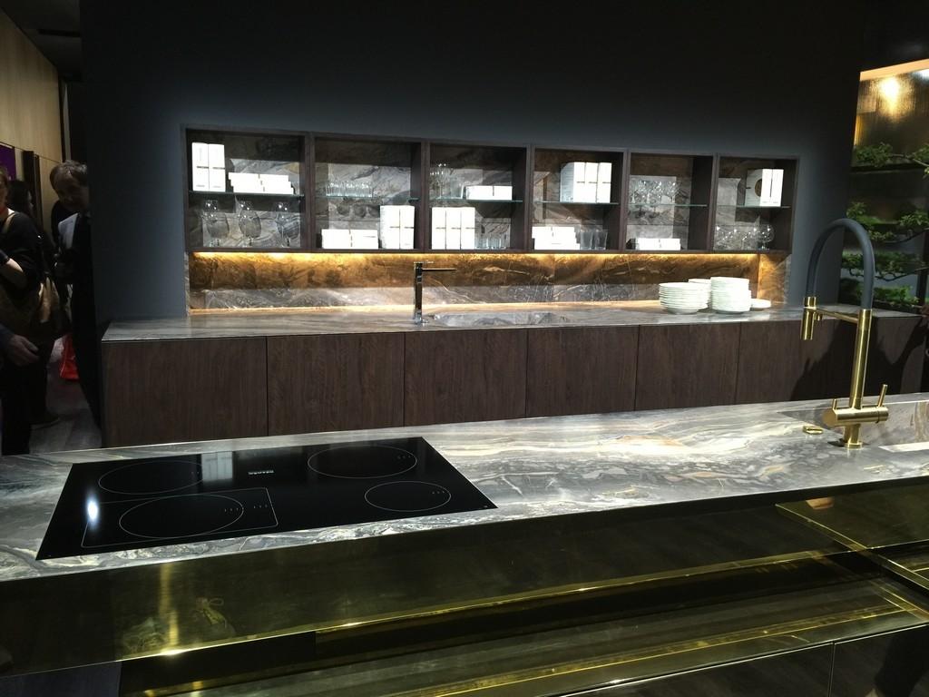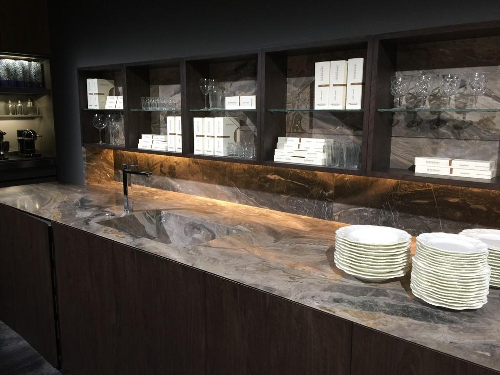 Отделка изысканным итальянским мрамором Arabescato Orobico Grigio органично встраивается в дизайн, придавая ему более сбалансированный, светлый вид. Мрамором покрыты все рабочие зоны столешниц. Им же облицована стена.