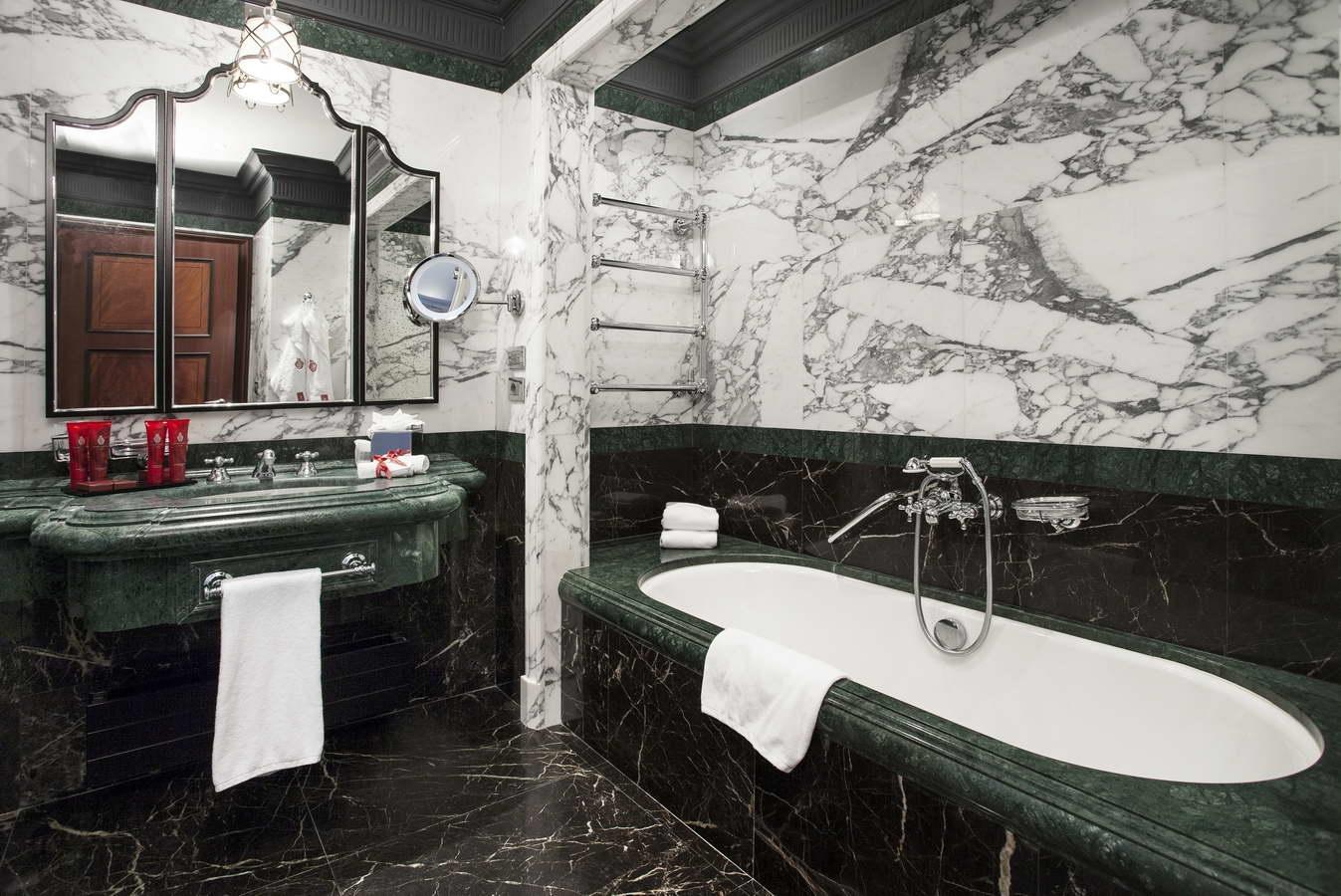Эта ванная комната придется по вкусу ценителям люксовых интерьерных решений. В отделке пространства были использованы лишь очень дорогие сорта природного камня: зеленый India Green, темно-шоколадный благородный Saint Laurent и белоснежный с прожилками Arabescato Corchia.