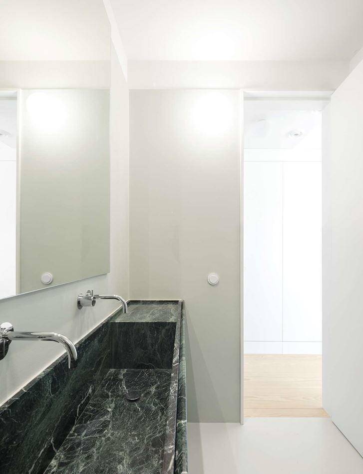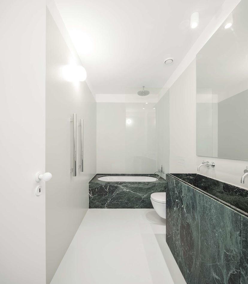 Перед нами интересный проект современной ванной комнаты, выдержанный в стилистике минимализма. Идеально белые стены, пол, сантехника не обременены никакими декоративными элементами. Простота и строгая геометрия формируют облик пространства. Единственным украшением комнаты является редкий зеленый мрамор Verde Guatemala (также носит название India Green), из которого изготовлена массивная стойка-раковина и постамент для ванны.