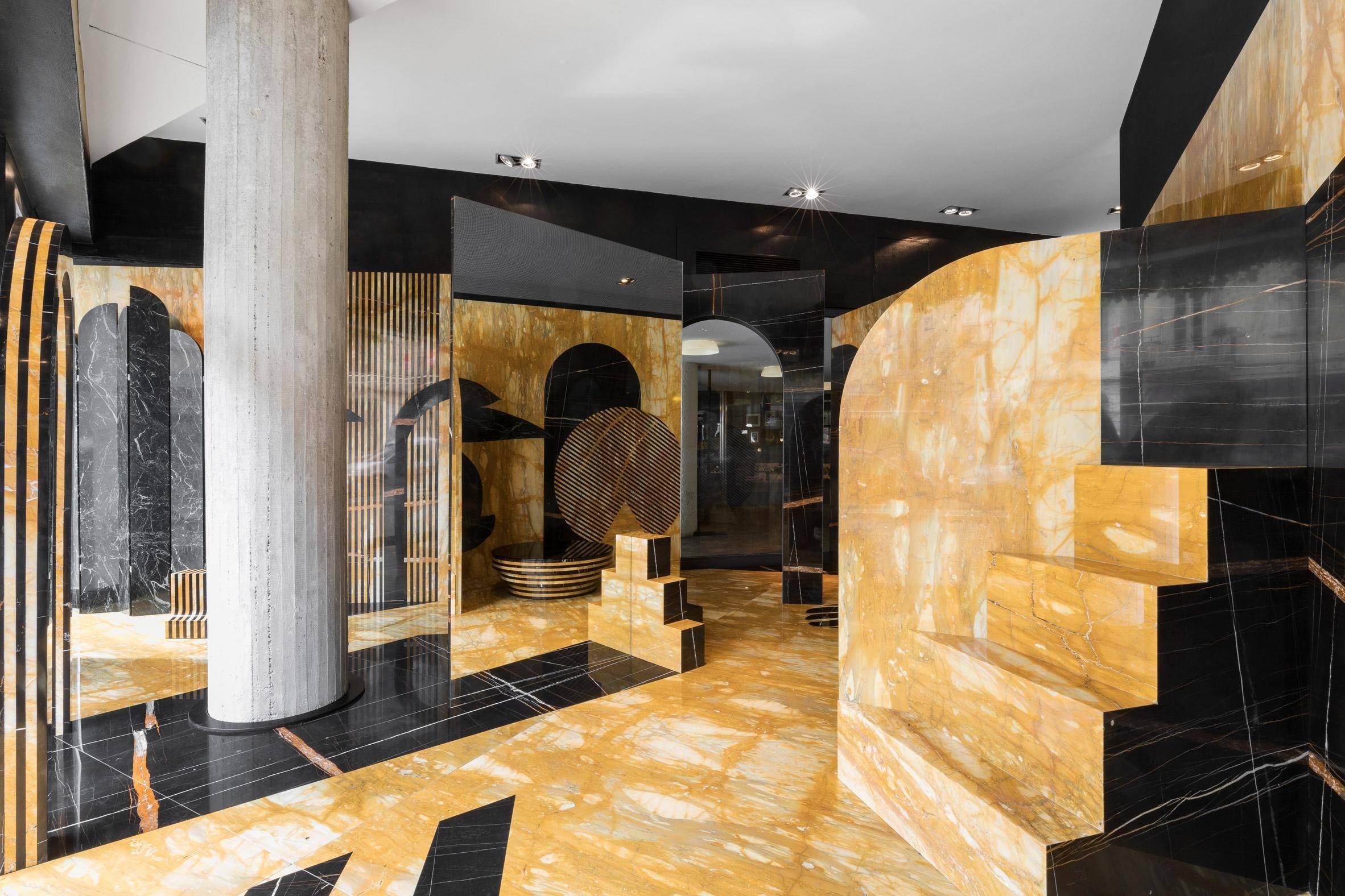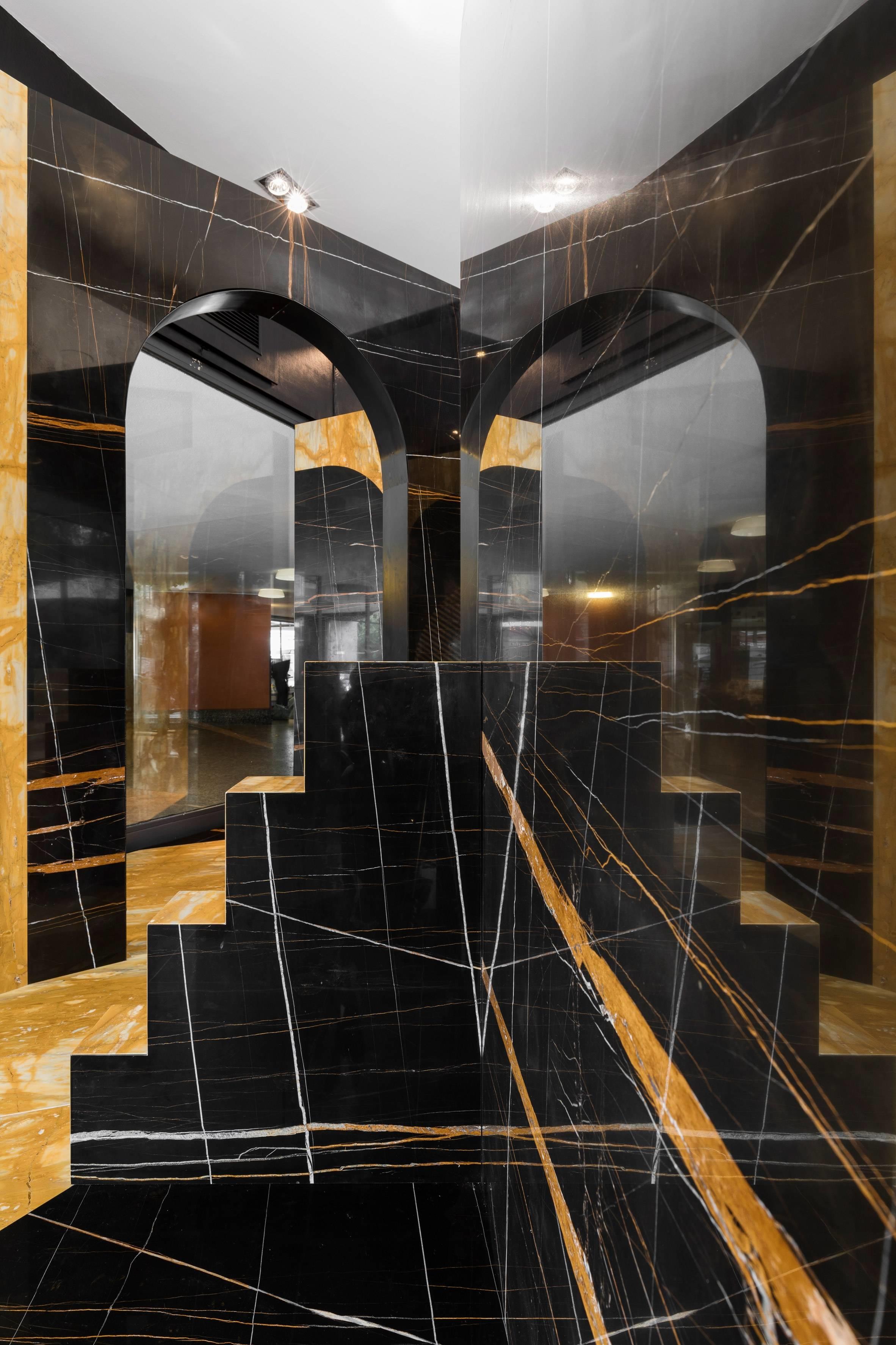 Дизайнеры стремились отвлечь гостей от шума выставки, погрузив их в мраморно-зазеркальный мир. Летиция и Маттэо прибегли к построению конструкции из элементов разных форм из желтого и черного камня. Крупные зеркала расширяют и без того сложное и наполненное пространство.