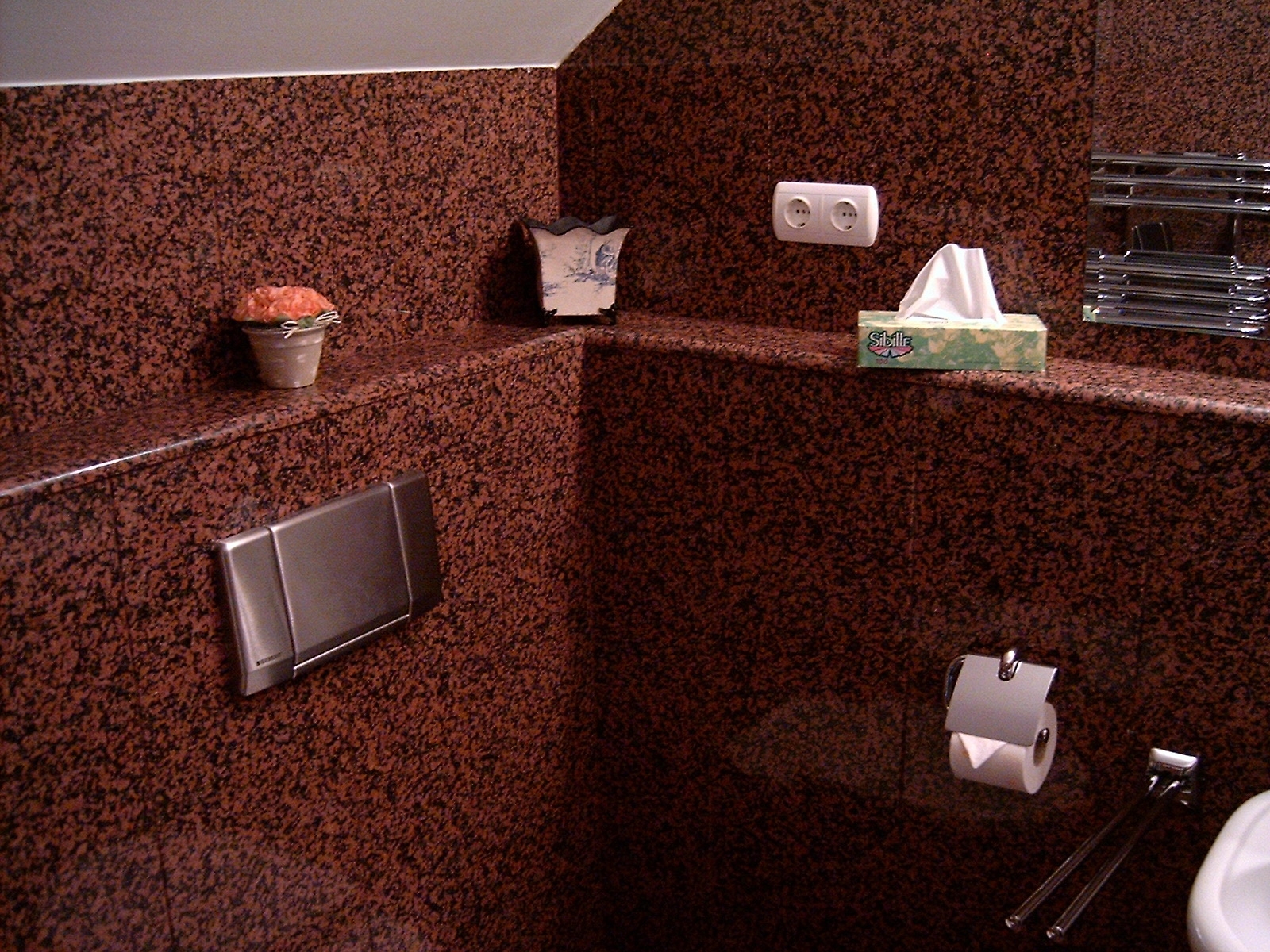 Стены ванной комнаты облицованы полированной плиткой гранита Balmoral Red. Терракотово-красный цвет камня позволяет создавать необычные интерьеры. Однако в данном проекте камень визуально сужает пространство.