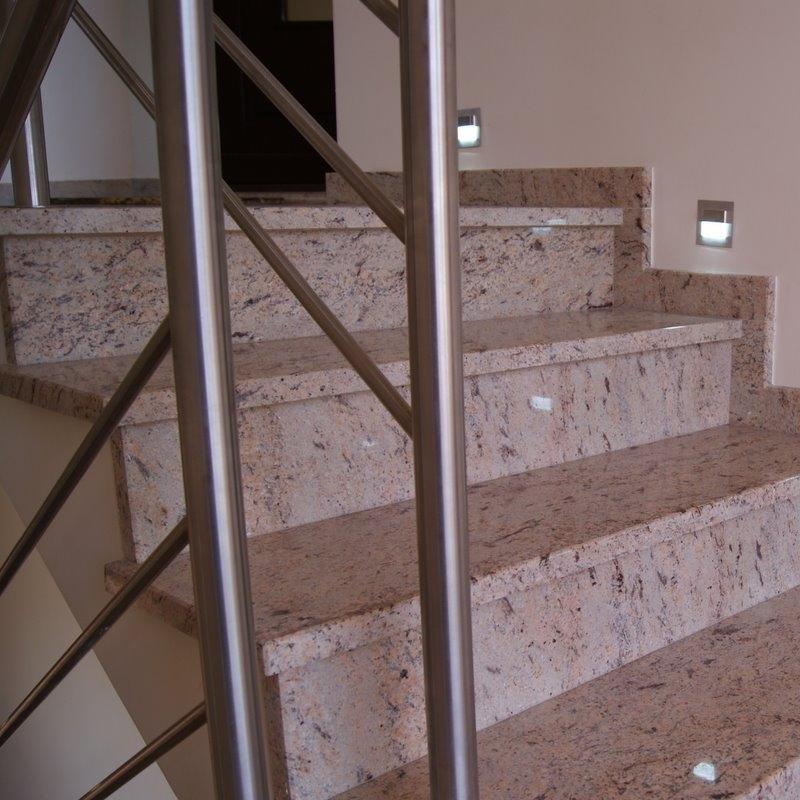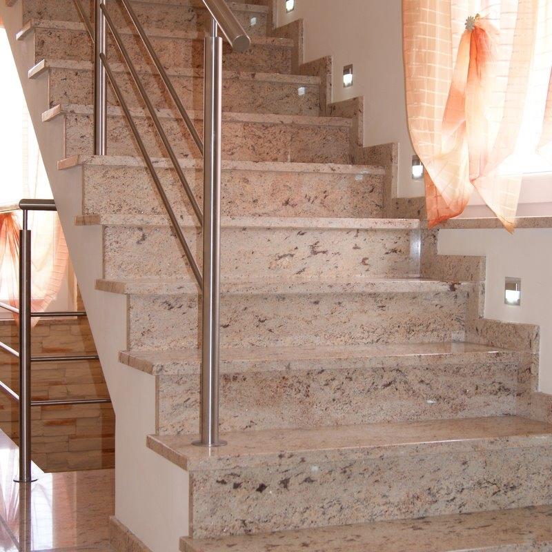 Лестница в частном доме облицована полированным гранитом из Индии - Ivory Brown. Этот необычный камень обладает приятной для глаза текстурой - нежным тепло-бежевым цветом с розоватым отливом и полосчатым рисунком более темных минеральных вкраплений.