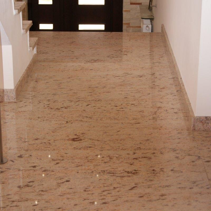 Из полированных слэбов выполнены проступи и подступенки лестницы, а так же этим камнем облицованы площадки и пол на втором этаже. Он же слагает плинтуса.