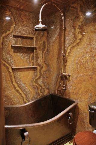 Перед нами весьма необычный проект ванной комнаты. Главным декоративным элементом пространства является мраморный оникс сорта Onyx Jasper. Он обладает выраженной узорчатой текстурой с прослойками красноватого, коричневого, желтого и оранжевого оттенков.