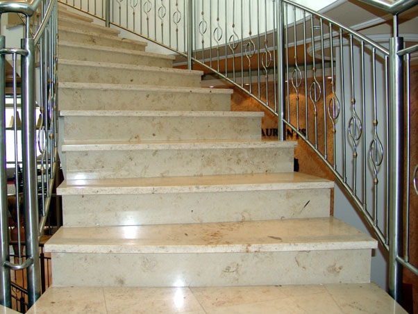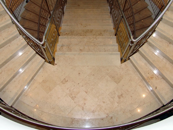 Ее ступени облицованы плитами юрского мраморизованного известняка бежевого цвета. Использовался камень со слабополированной фактурой - обработка средняя между лощением и полировкой. Она придает этот неглянцевый спокойный блеск. Юрским камнем облицованы ступени, подступенки и пол между маршами.