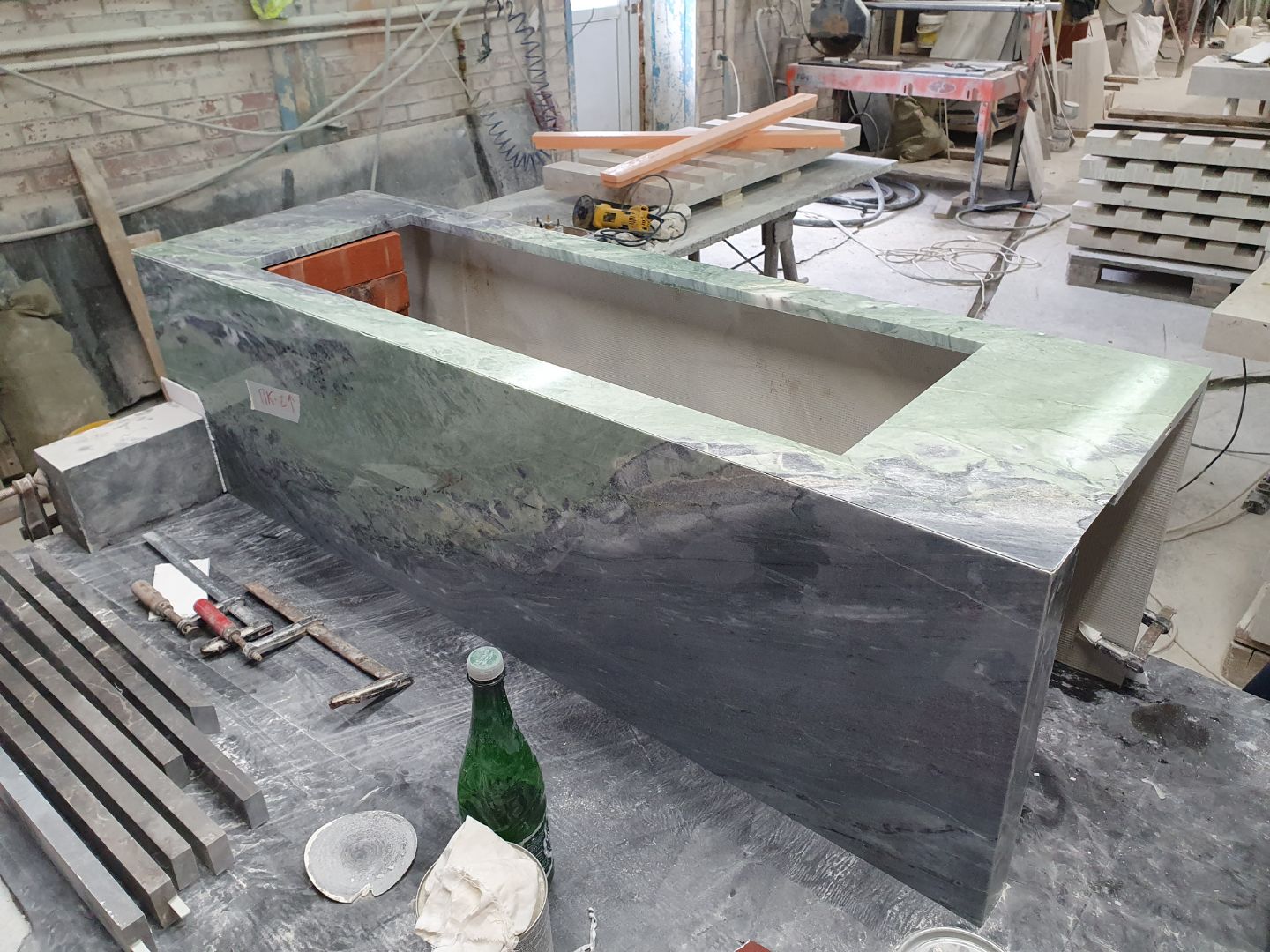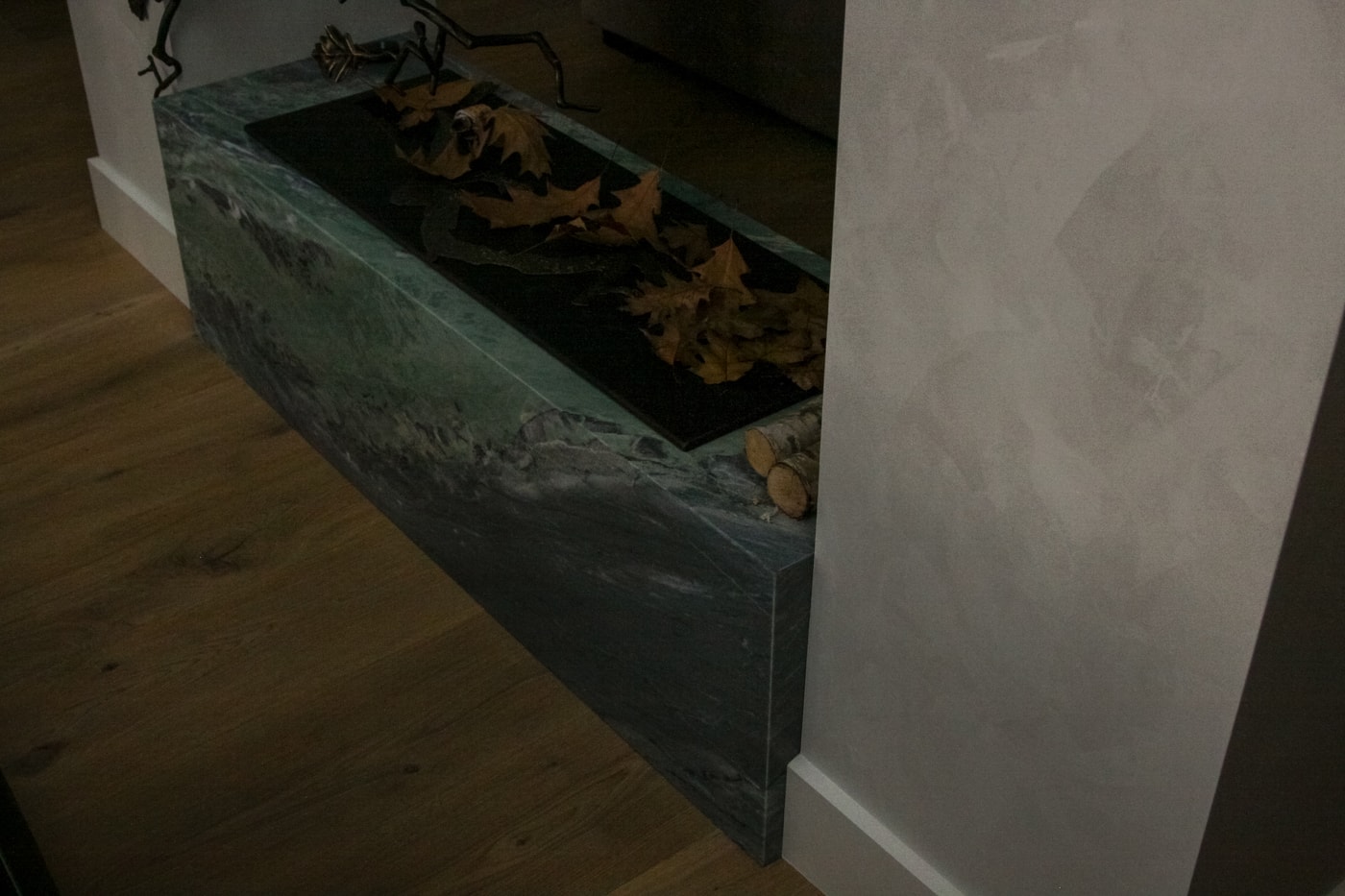 Детали облицовки были вырезаны из одного слэба таким образом, чтобы рисунок камня перетекал из одной плоскости в другую. Благодаря углам под 45° и мастерской финишной полировке, камин выглядит как цельный блок камня.