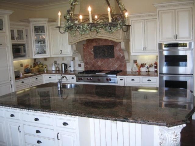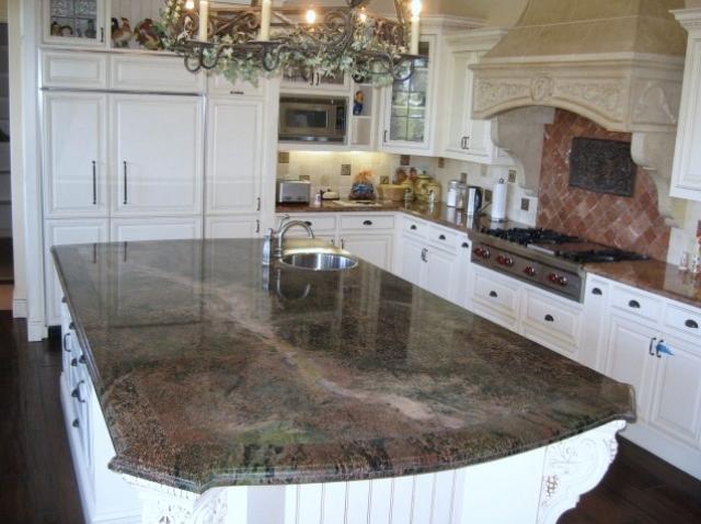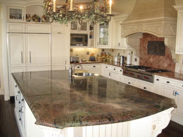 Из этого камня выполнена столешница для кухонного острова - поверхность выразительной формы с резным профилем, выполненная из единого слэба гранита. Фактура поверхности - полировка.