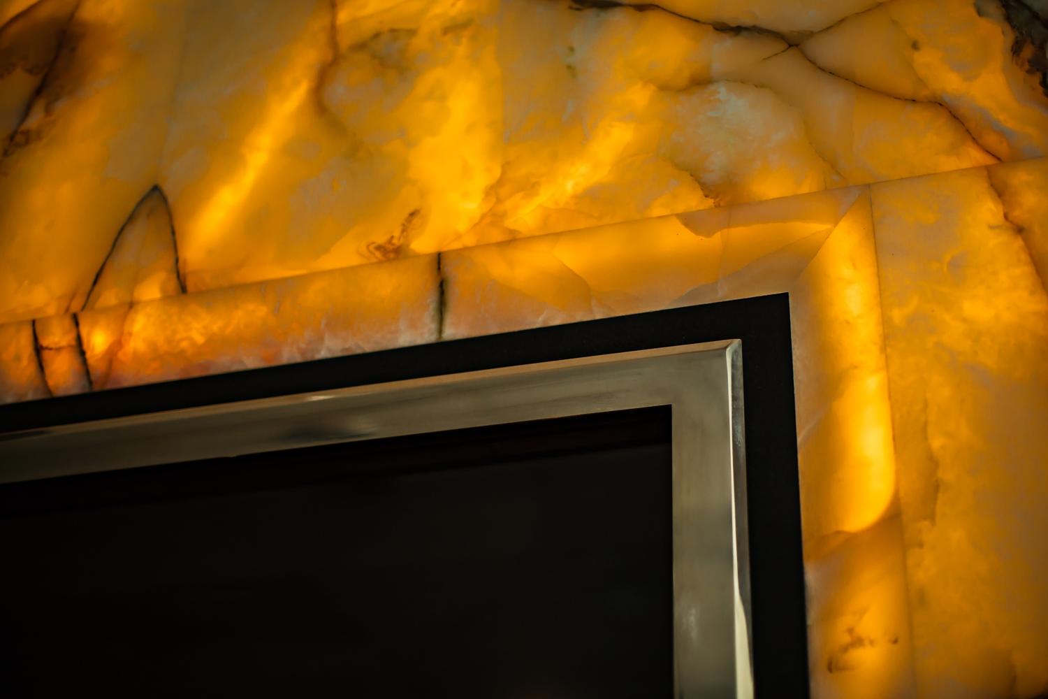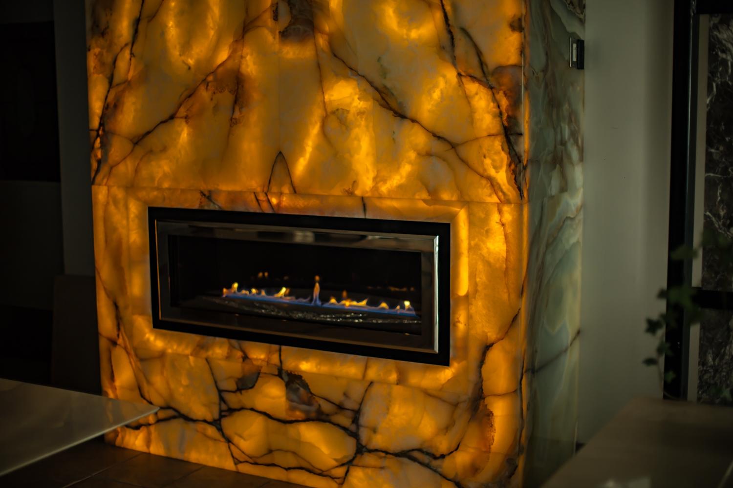 Перед нами уникальный проект каминного портала для частного дома. Камин от пола до потолка облицован плитами полупрозрачного мраморного оникса Kilimanjaro - живописного желтого камня с узорчатой текстурой. Для проекта были отобраны плиты с симметричным рисунком и большим количеством темных жил. Которые потом были собраны по методу раскладки "бабочкой", образовав выразительный узор.
