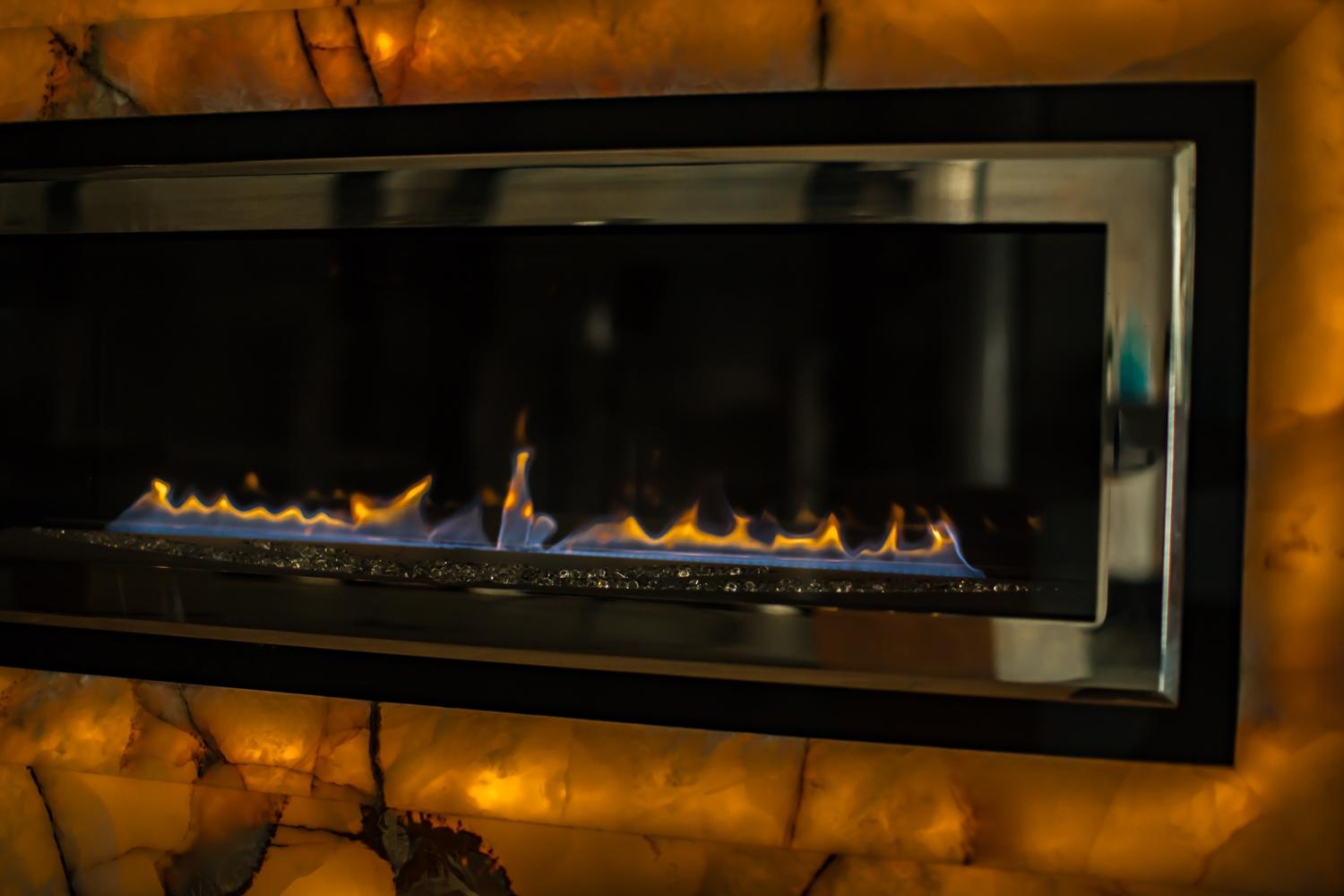 В этом каминном портале совмещены все модные интерьерные тенденции последних лет: крупные габариты каменного полотна, подсветка оникса, симметричный рисунок "бабочкой".