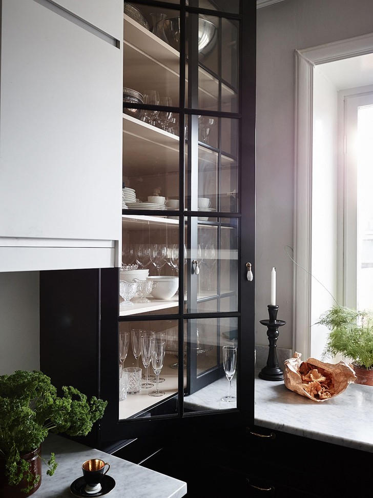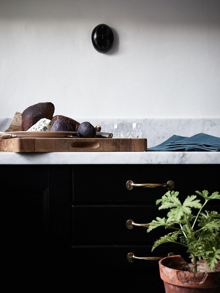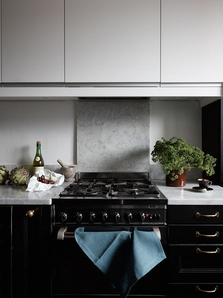 Столешницы и низкие фартуки этой кухни выполнены из легендарного, самого востребованного в мире мрамора — каррарской классики Bianco Carrara.