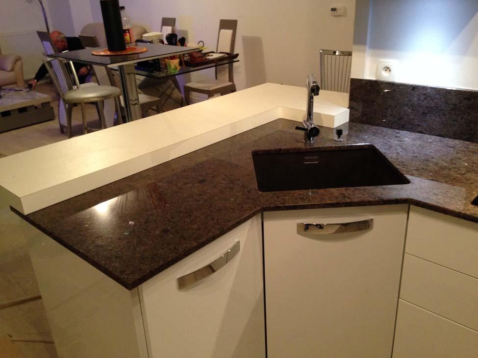Итак, для отделки столешниц кухонного гарнитура были использованы слэбы Labrador Antique толщиной 2 сантиметра (нехарактерная толщина для столешниц). Но, учитывая, что этот камень весьма и весьма прочный, такой толщины будет достаточно. Этим же камнем облицованы фартуки по периметру.