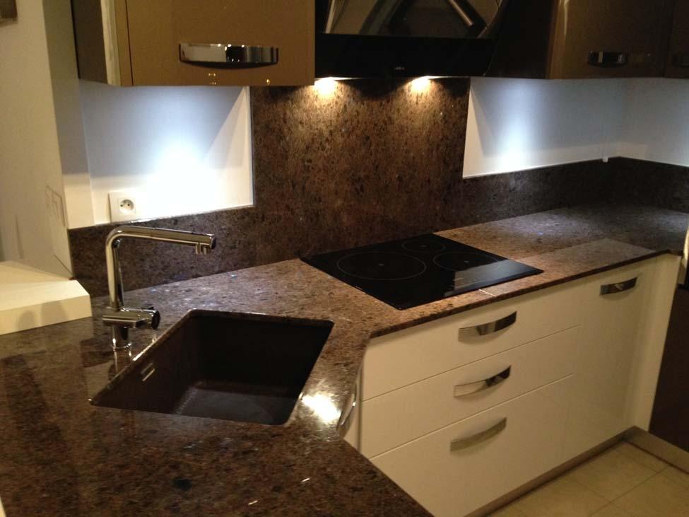 В данном случае красота этого камня слабо раскрыта: кухня удалена от источника дневного света, а электрическое освещение весьма низкого уровня..