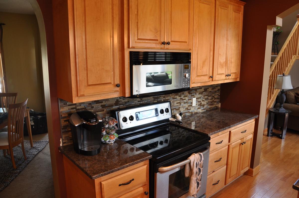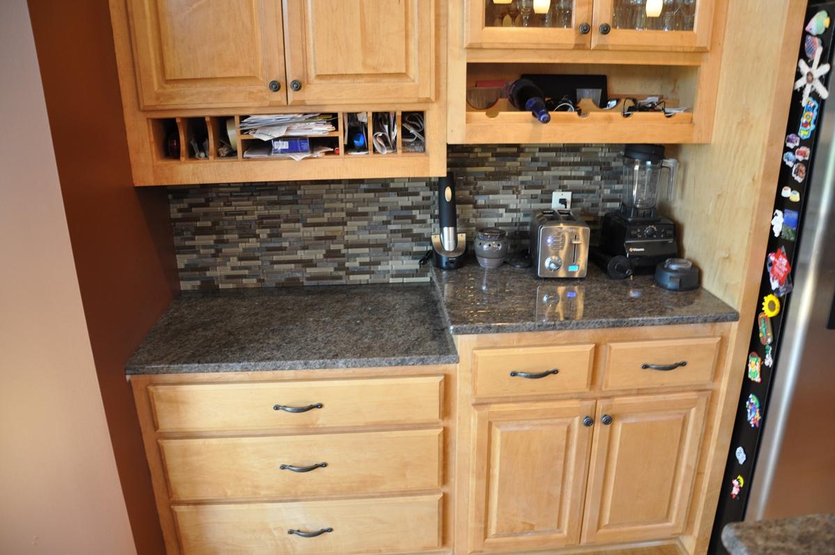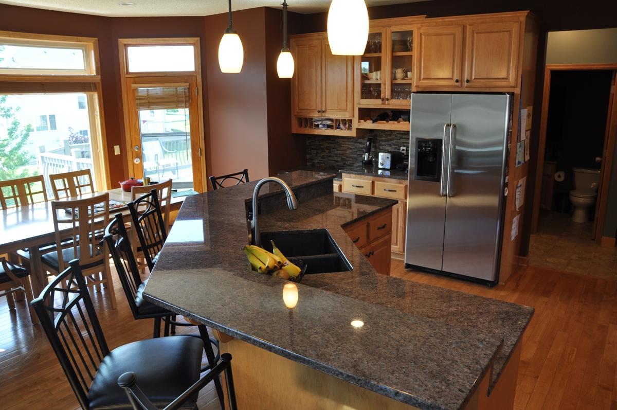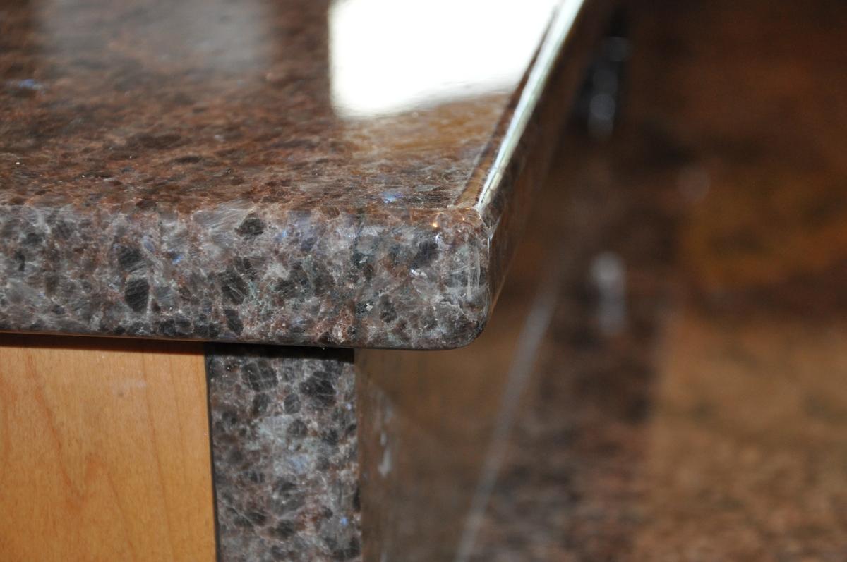 Столешницы рабочих поверхностей кухонного гарнитура, а также двух-ярусная барная стойка, покрыты камнем редкой красоты - Labrador Antique. Этот камень имеет среднезернистую структуру, основная масса тепло-коричневого оттенка вмещает в себя кристаллики с перламутровыми переливами. Это включения минерала лабрадора, который меняет оттенок при смене угла обзора или степени освещенности (этот эффект называется "иризация").