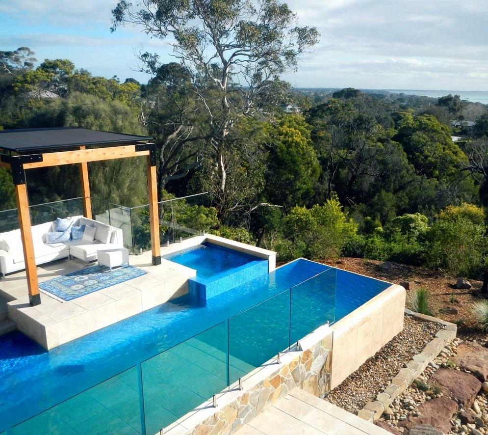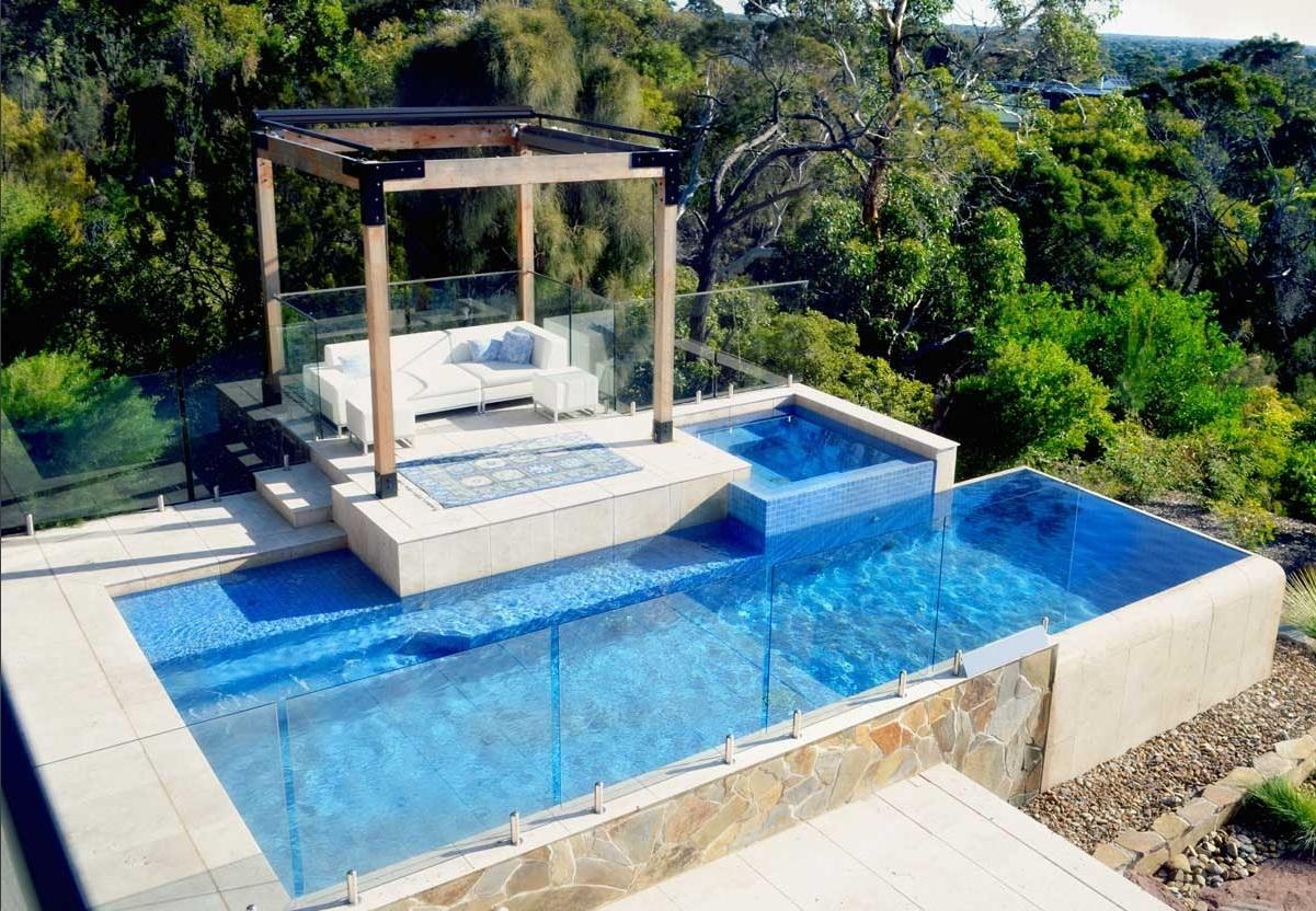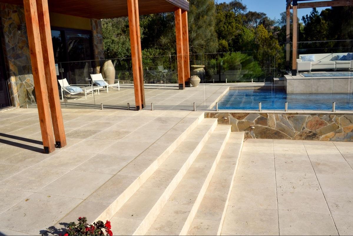 Плиты мощения, ступени лестницы, постамент для бассейна, пол в беседке - все это выполнено из светлого травертина Travertine Light. Светлый кремово-бежевый камень в лощеной обработке смотрится естественно и органично для окружающей среды. Пористый, теплый, шероховатый камень обладает минимальным скольжением, поэтому прекрасно подходит для отделки пространства вокруг бассейна.