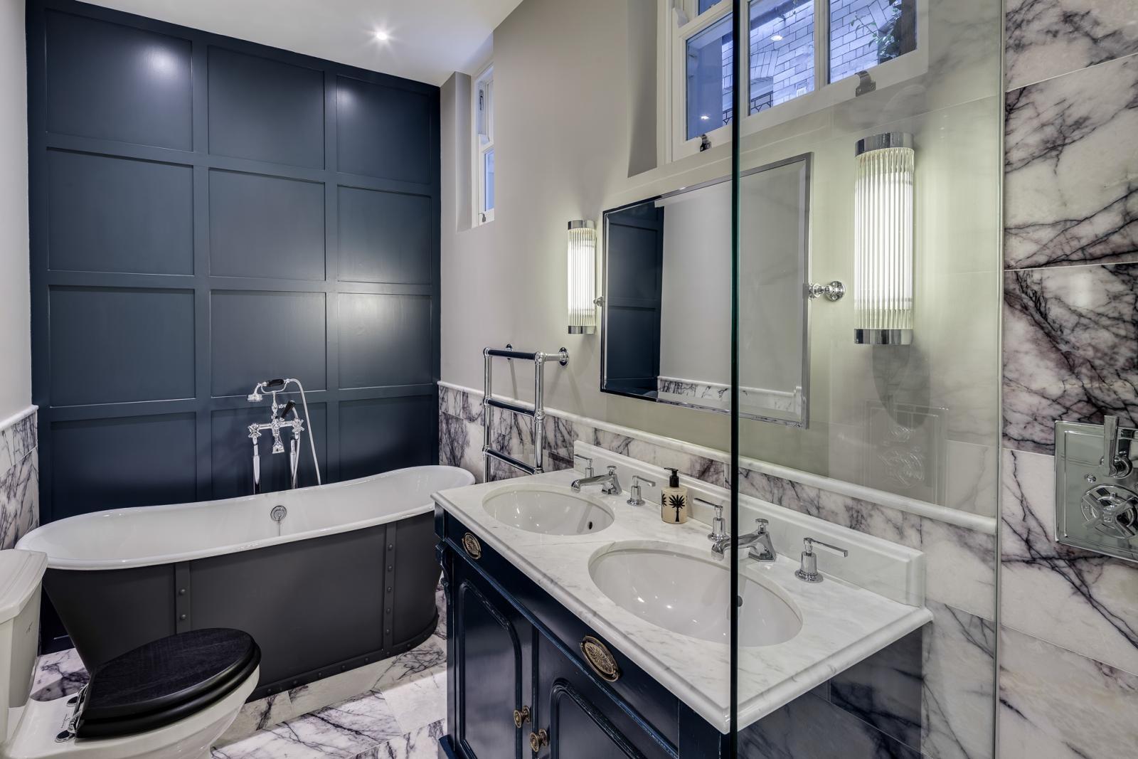 В интерьере также задействован каррарский мрамор высокого качества - Bianco Gioia. Из него вырезана столешница для раковин, украшенная сложным резным торцом. Им же облицован поддон в душевой кабине - в виде мозаики.