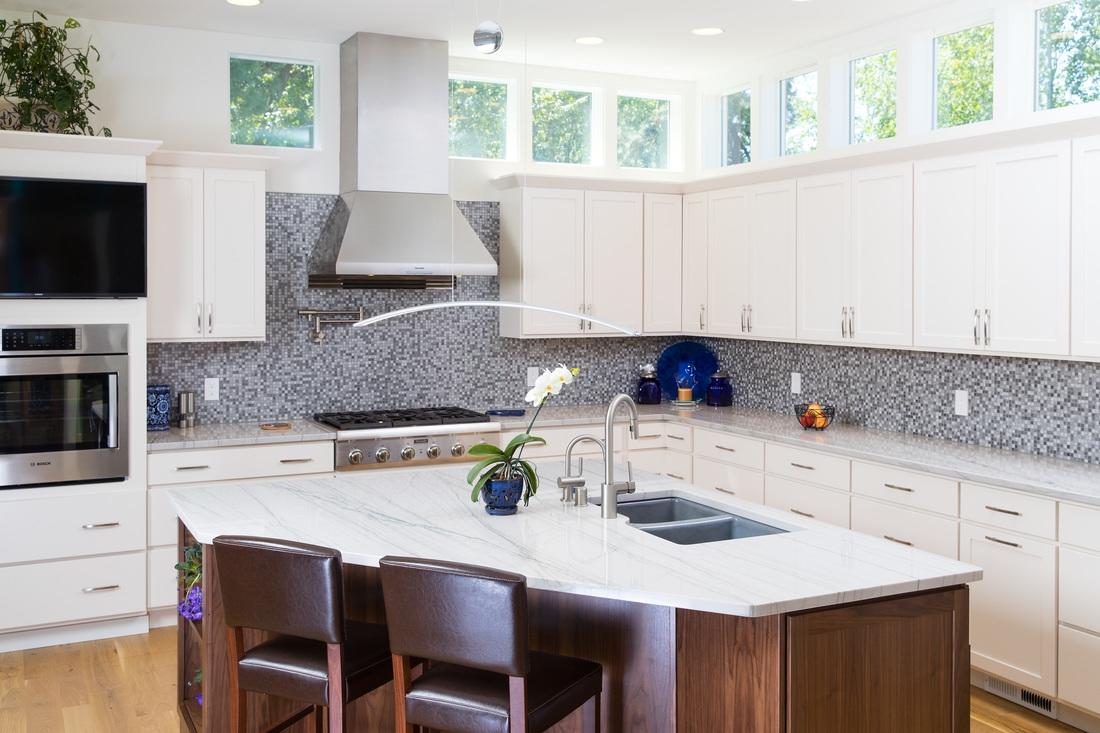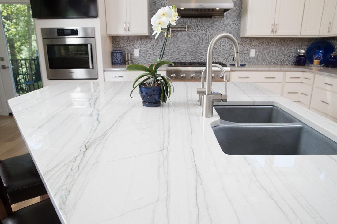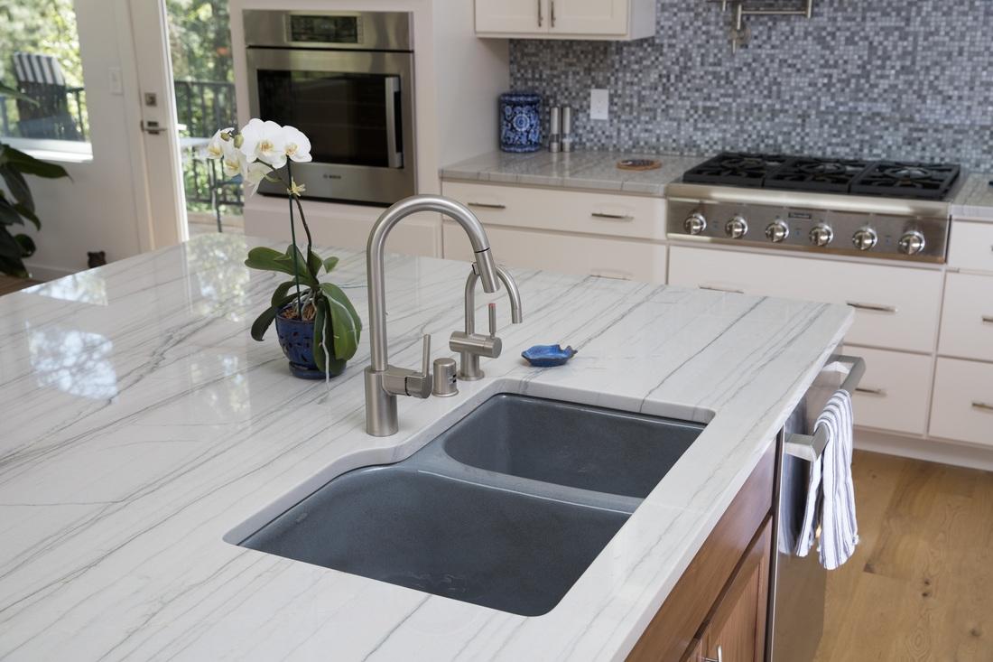 Для отделки рабочей зоны заказчик выбирал материал белого цвета. Сперва он остановил свой выбор на классическом белом мраморе с легким рисунком серых прожилок. Однако, выяснив высокий уровень загрузки на кухне (в доме будет жить большая семья), наши мастера посоветовали выбрать более устойчивый камень. Кварцит Bianco Macaubas - превосходный аналог мрамора. Он обладает белоснежным тоном и мелкозернистой структурой. Но у него есть одно весомое преимущество - его прочностные характеристики. Это очень плотный и твердый камень, состоящий из мельчайших кварцевых частиц (а кварц, как известно, один из самых прочных породообразующих минералов). Кварцит не вступает в реакцию с бытовыми и пищевыми кислотами. Его сложно поцарапать и почти невозможно оставить невыводимое пятно. В этом заключаются его главные отличия от мрамора.