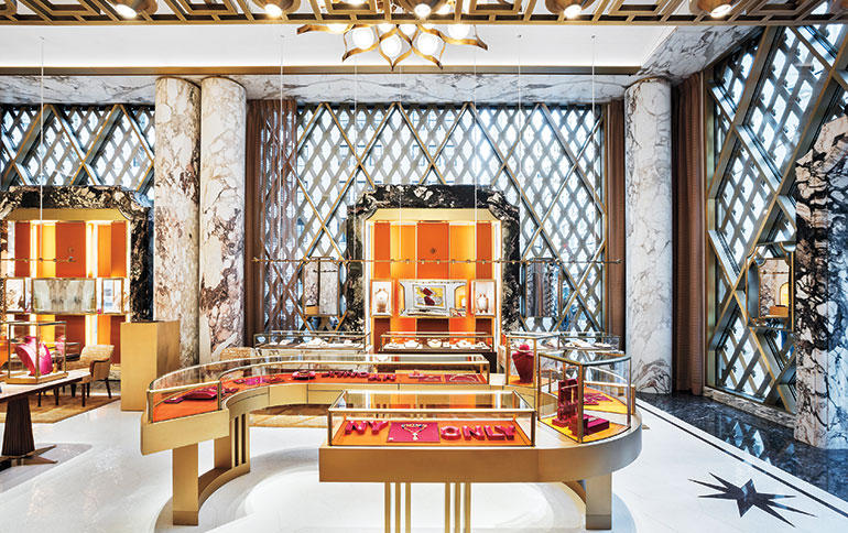 Для бутика архитектор выбрал сразу пять сортов итальянского мрамора. "Желтый, оранжевый, красный, — я никогда раньше не оформлял шоу-рум с использованием этих цветов". Ключевая особенность магазина — самые дорогостоящие ювелирные изделия не спрятаны в задних помещениях. Все объекты выставлены на показ гостям, посетителям и туристам.