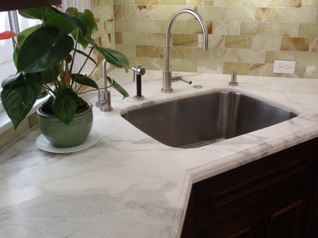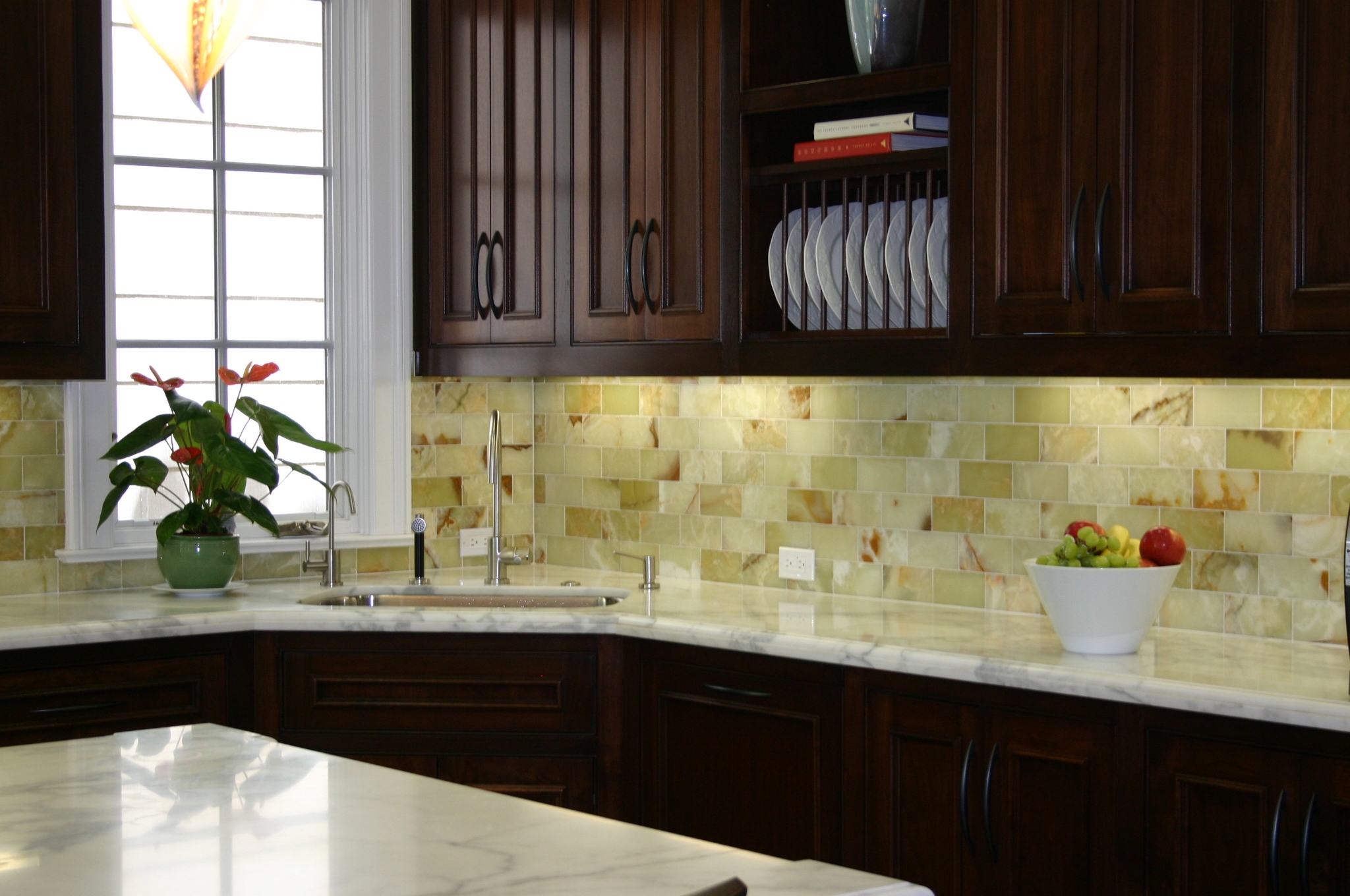 Особенно ярко и необычно смотрится кухонный фартук, облицованный плиткой мраморного оникса Pakistan Green. Тут использовалась редкая более светлая разновидность этого камня. Полированная тонкая плитка смотрится полупрозрачной, легко пропускающей свет, даже при наружных источниках освещения.