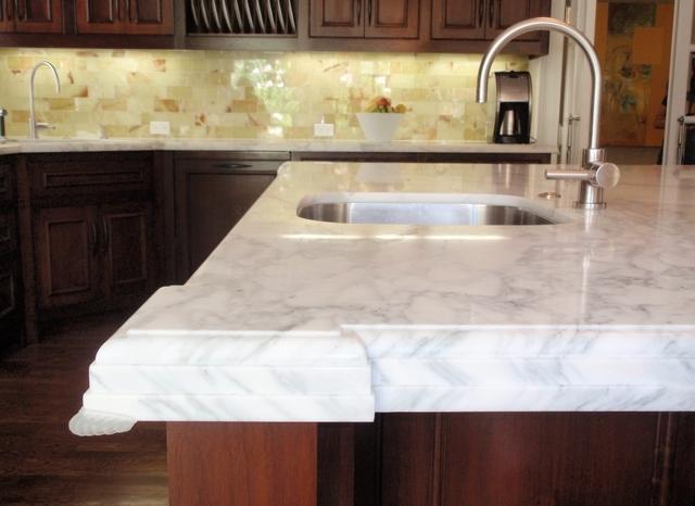 Все рабочие поверхности (и столешницы по периметру, и поверхность стола-острова) вырезаны из каррарского мрамора высокого качества - Bianco Gioia. Столешницы рабочих поверхностей вырезаны из крупных слэбов толщиной 3 сантиметра. Проектировщик стремился к минимальному количеству стыков. Столешница же стола-острова вырезана из нетипового толстомера (толщиной 5 сантиметра). Стол украшен сложным резным профилем, который придает этому массивному столу еще большую основательность и добротность.