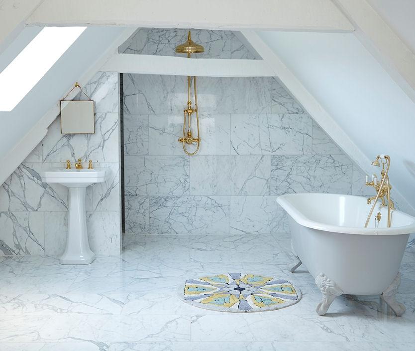 Роскошная ванная комната в мраморе Volakas. Стены и полы выполнены из полированного греческого мрамора Volakas. Комната расположена на последнем этаже в помещении мансарды. Мы видим удивительное стилистическое решение: повсеместная облицовка белоснежным мрамором в «чердачном» пространстве! Оказывается, дорогой греческий мрамор, золотистая сантехника и деревянные потолочные балки прекрасно гармонируют друг с другом.