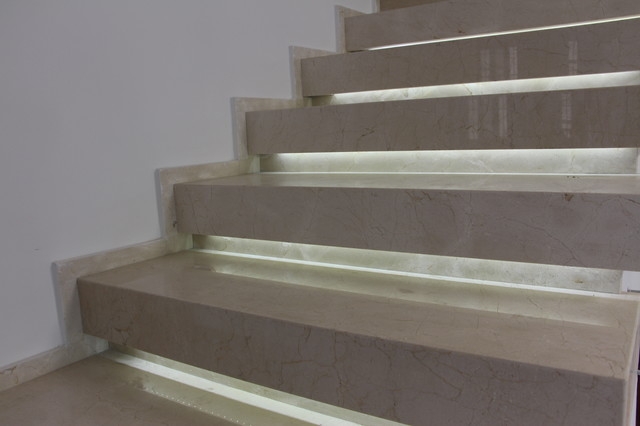 Мы видим нетиповой проект интерьерной лестницы в загородном доме. Проект находится в стадии доработки, но основная масса работы уже выполнена. Лестница имеет прямую конструкцию, воплощенную в простом и лаконичном стиле минимализм. Ступени представляют собой цельные прямоугольные блоки, вырезанные из толстомера испанского мрамора Crema Marfil. Массивная ступень заметно экономит время и силы, особенно в сравнении с обычной облицовкой, но в разы утяжеляет всю конструкцию и повышает стоимость проекта. Однако Вы можете быть уверены в долголетии такой лестницы - цельные каменные ступени, не истираясь, служат многие столетия.