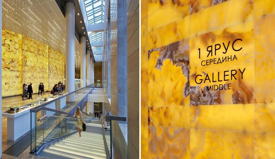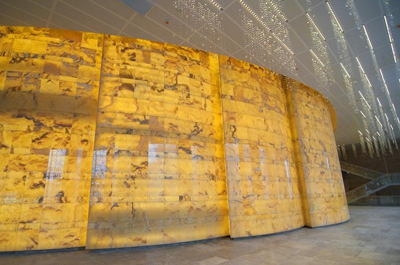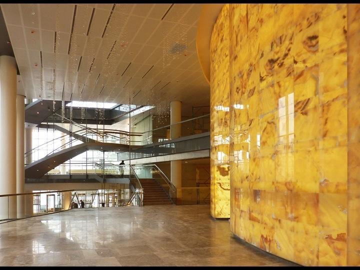 В создании неповторимого облика театра было задействовано колоссальное количество качественных отделочных материалов. К примеру стена непосредственно вокруг сцены облицована мраморным ониксом Alabastro. Общее количество камня превышает 4000 квадратных метров. Использовалась полированная плитка, установленноая на металлическую конструкцию со светодиодной подсветкой.