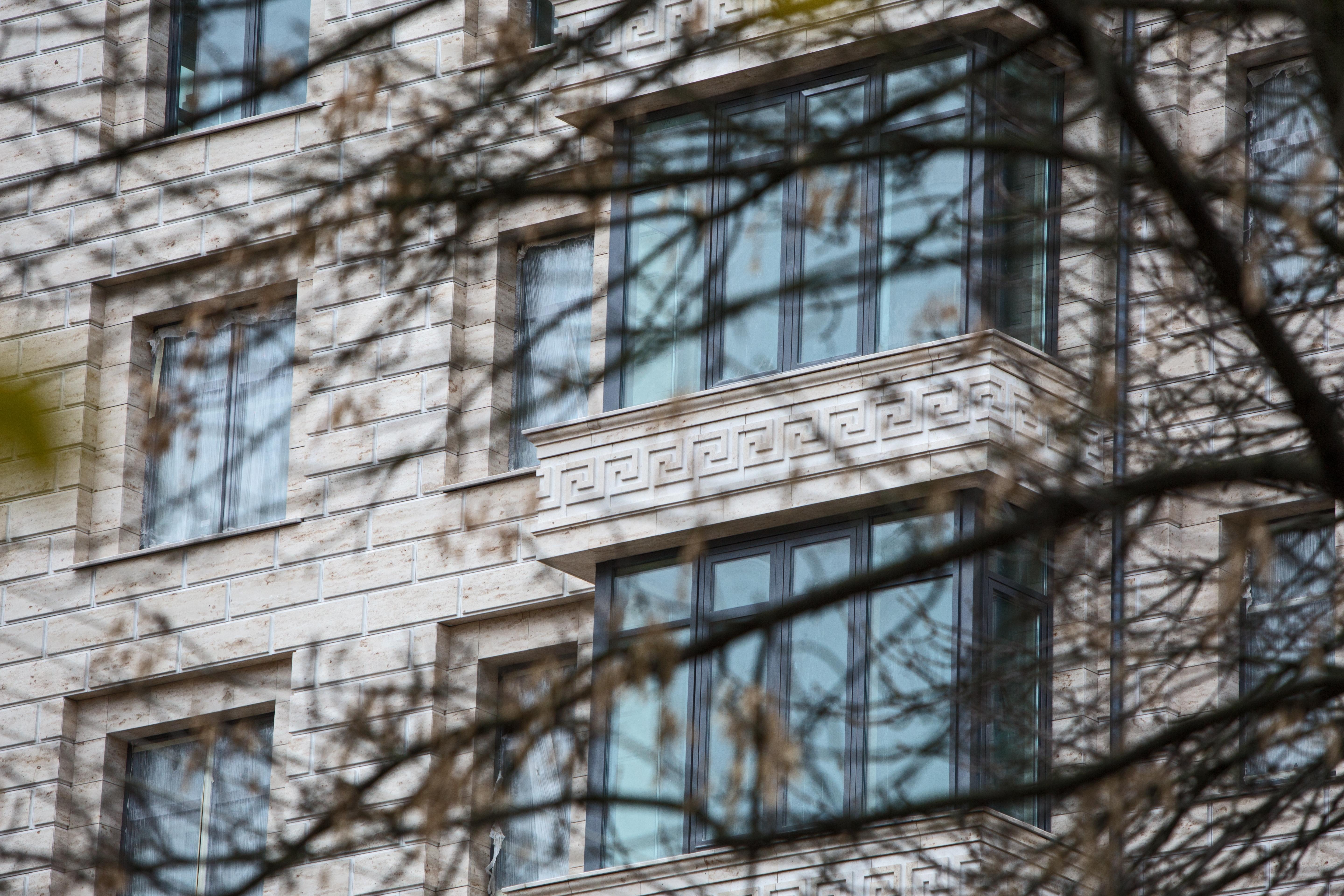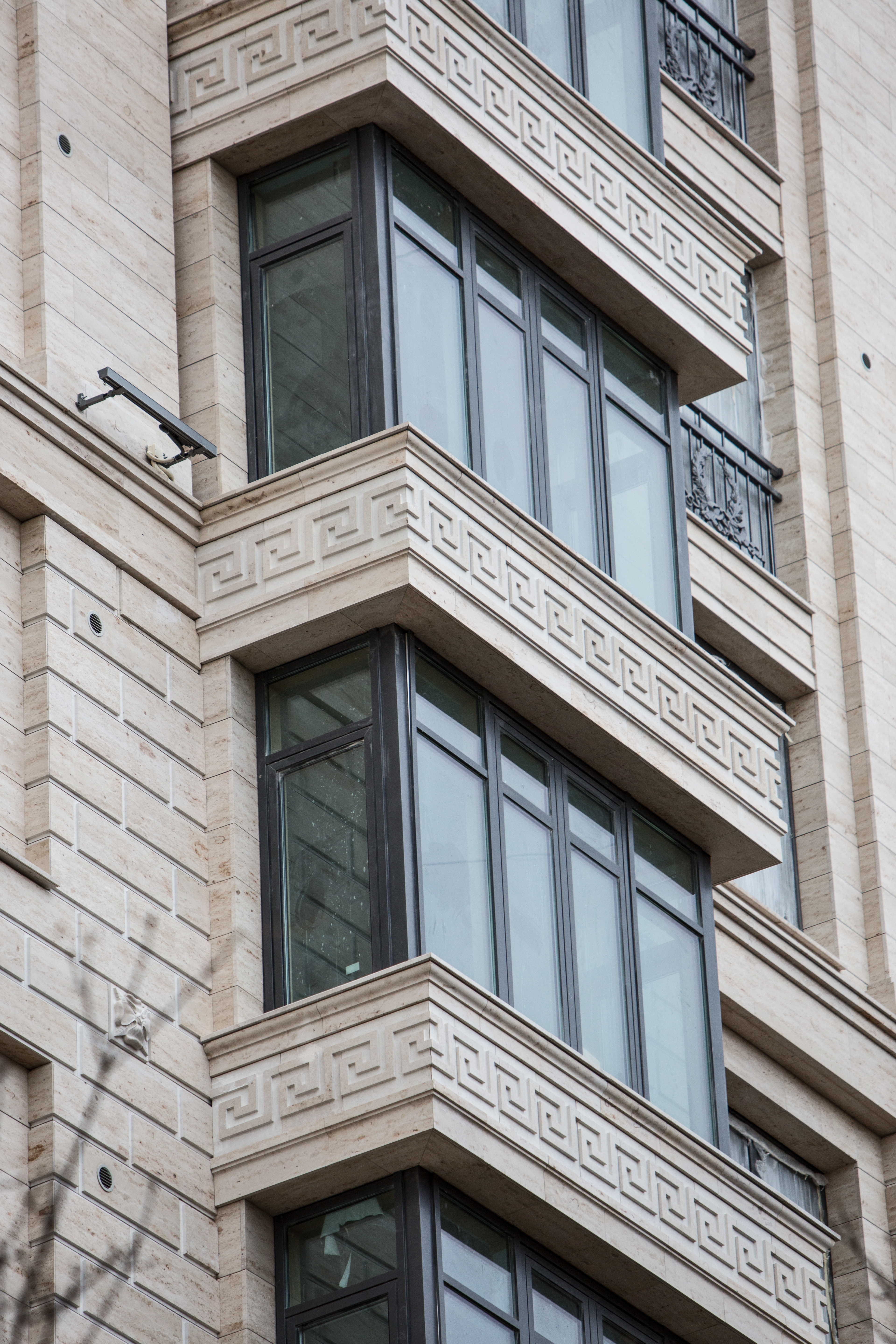 Рассматриваем проект фасадного декора жилого комплекса премиум-класса. И декор, и базовая отделка - все выполнено из бежевого юрского камня с выраженной полосчатостью Jura Rahmweis.