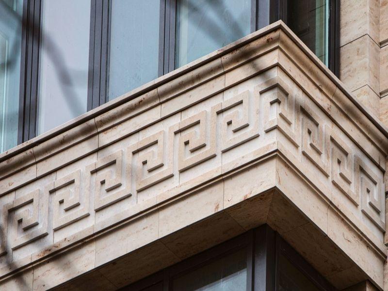 На фотографиях представлен яркий архитектурный элемент фасада - резной фриз с меандрами, украшающий верхние балконы. Его общая протяженность превышает 200 погонных метра.