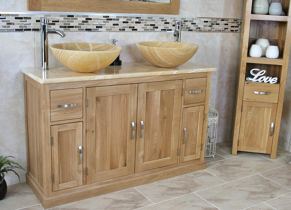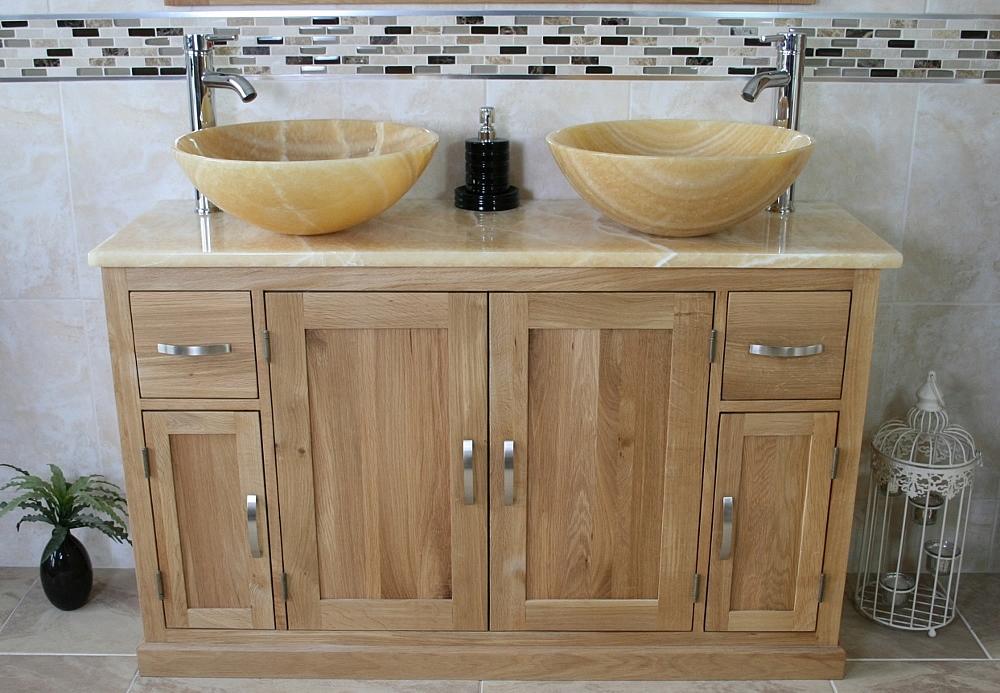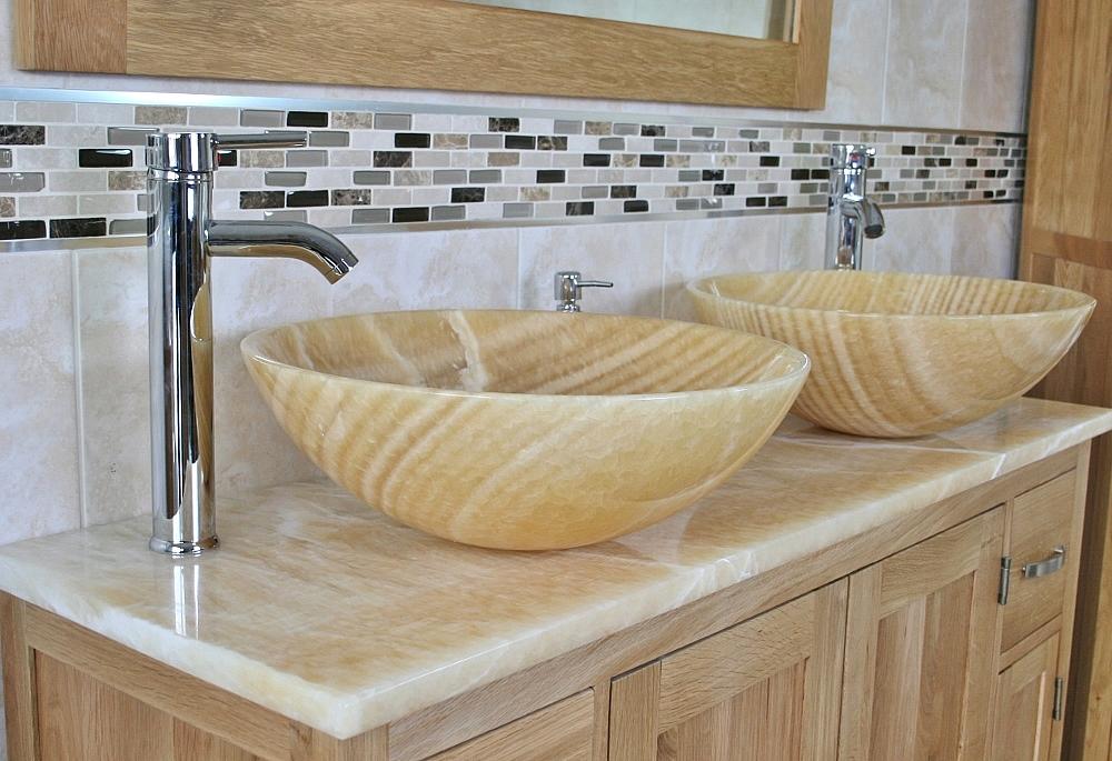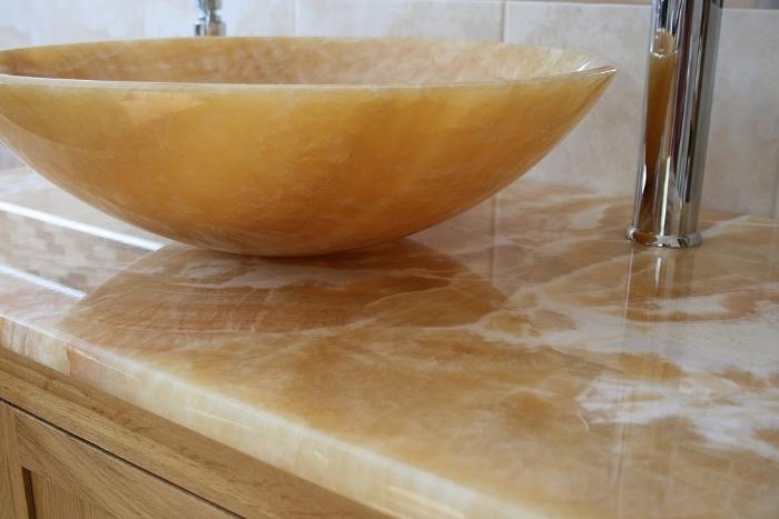 Столешница и установленные на ней мойки выполнены из желтого мраморного оникса Onyx Miele.