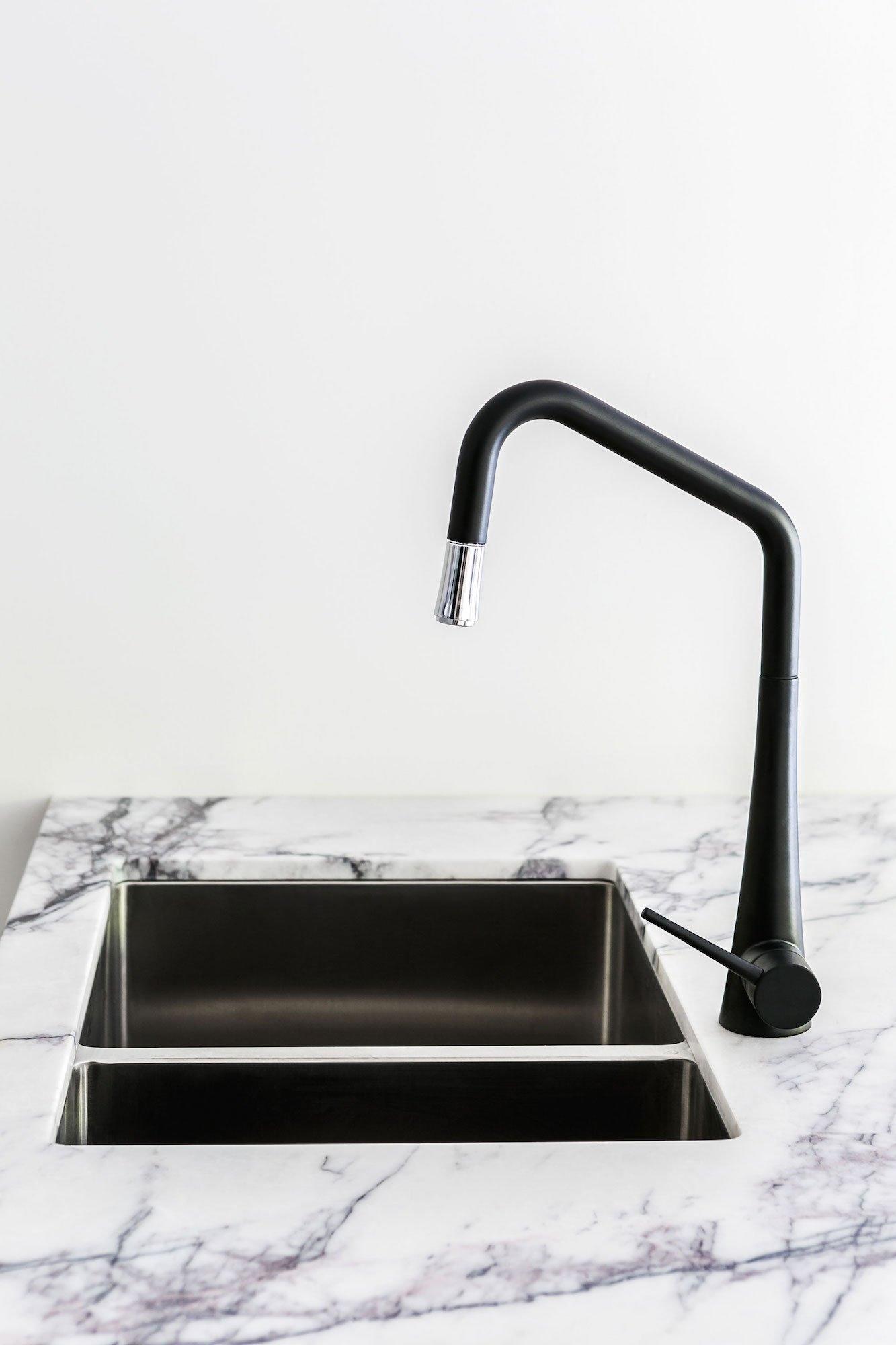 В данном проекте этот мрамор задействован в виде фартука в рабочей зоне и столешницы для кухонного острова.