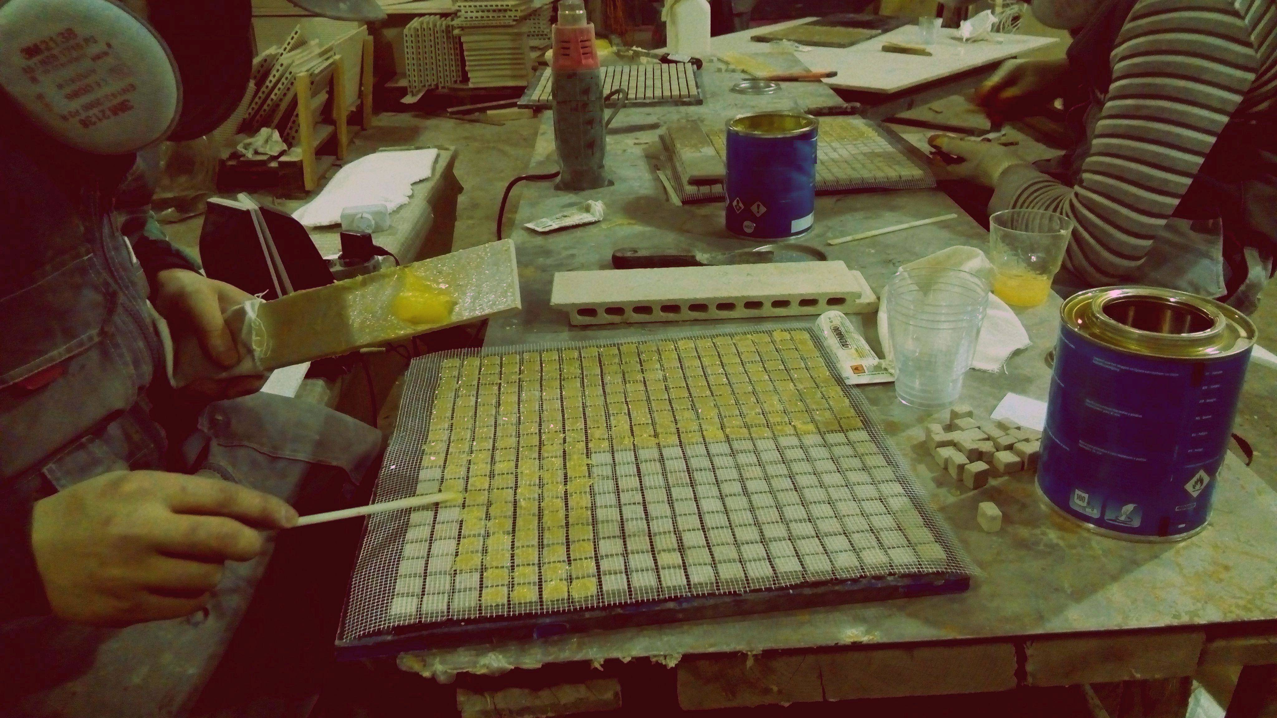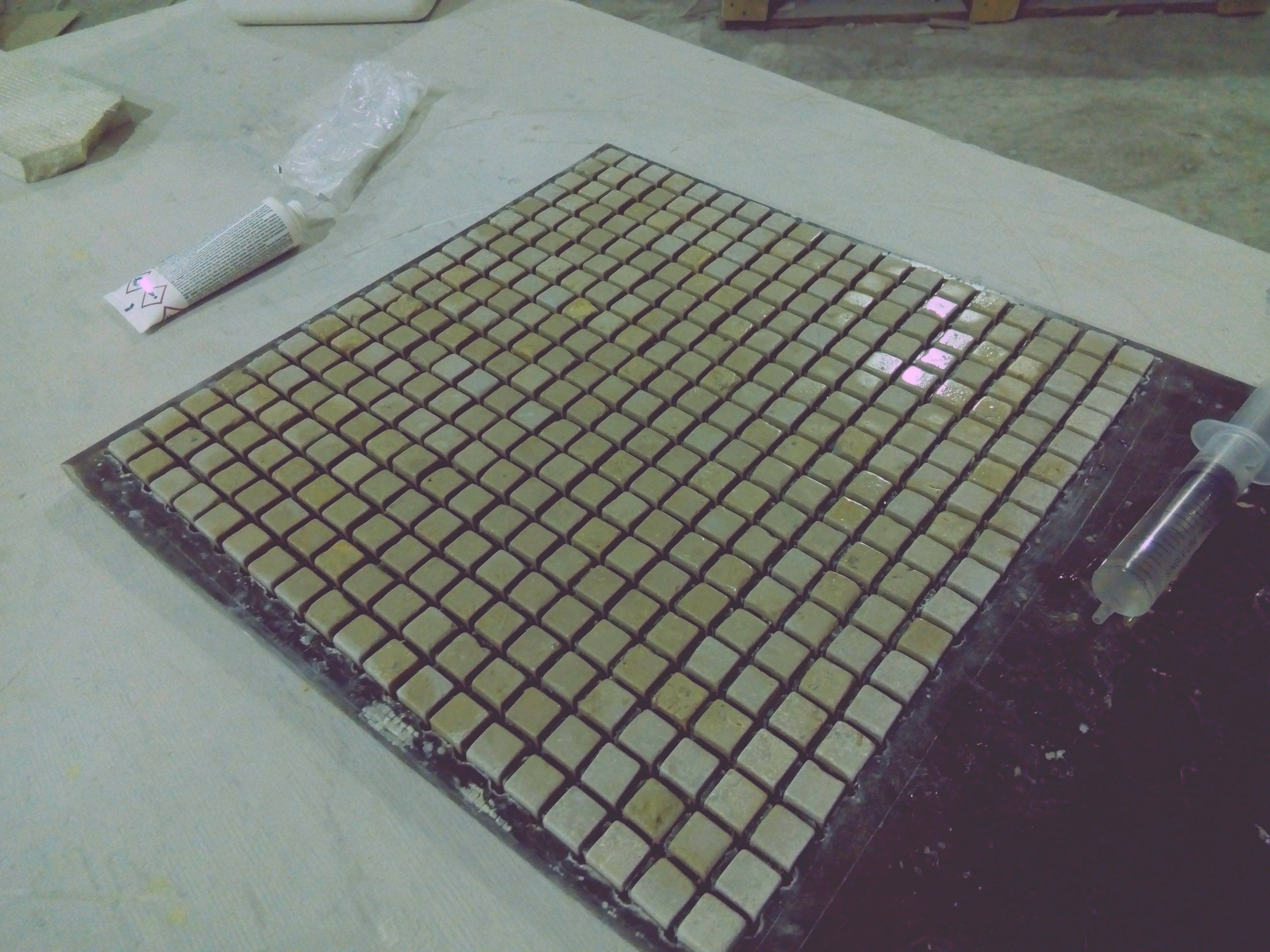 После галтовки плитки отмывались от каменной пыли. А потом мастер вручную подбирал одинаковые квадратики без брака и сколов. Плитки складывались в специальную пластиковую матрицу, предназначенную для этих целей. Ее ниши рассчитаны на плитки 1х1 с выверенным расстоянием между ними. Плитки складывались лицевой стороной вниз.