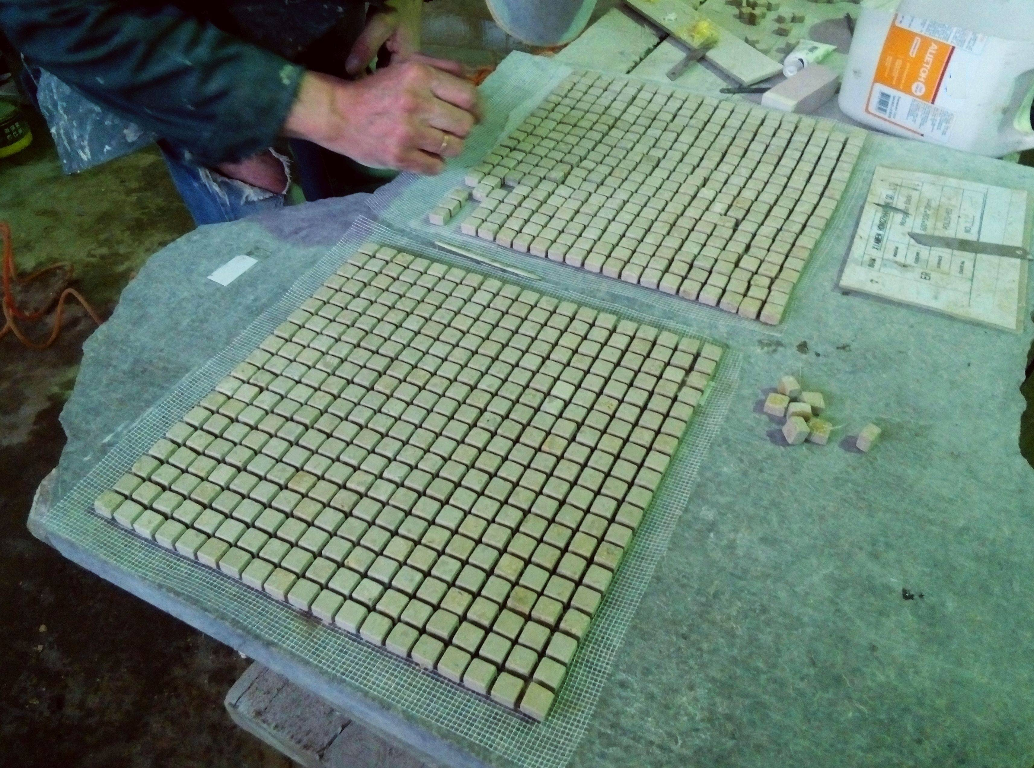 Затем на матрицу с заполненными полостями накладывается сетка. И сверху каждого элемента мозаики капается надежный клей, адаптированный к природному камню. Он не оставляет следов и высолов после высыхания.