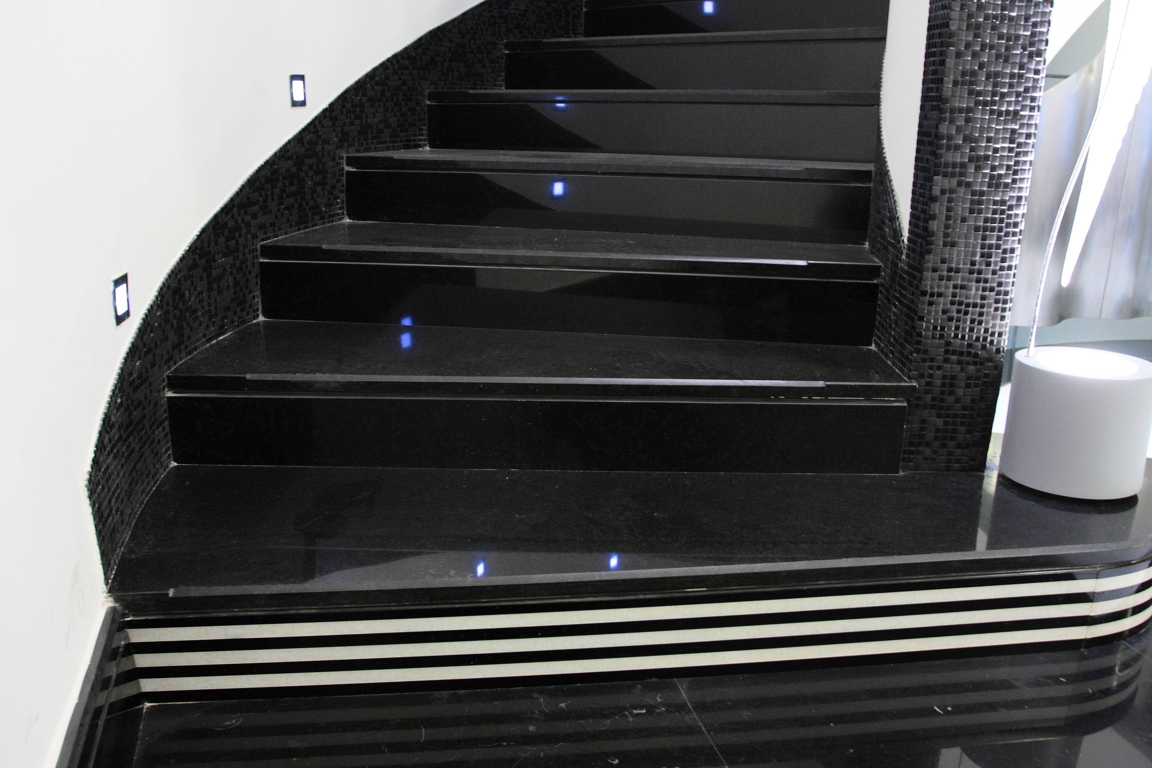 Интерьерная винтовая лестница выполнена из базальта Nero Africa. В полированной обработке этот камень приобретает насыщенный черный цвет и почти зеркальный блеск.