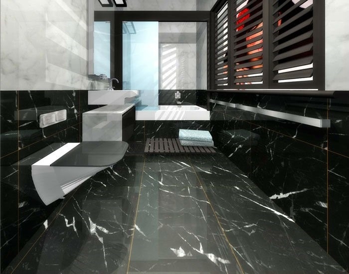 Мы видим проект сверхсовременной ванной комнаты, решенный в черно-белой гамме. Мрамором Nero Marquina облицованы пол и нижняя часть стен, из него же сделан постамент для ванны. Классическое сочетание черного и белого в интерьере никогда не теряет своей актуальности.