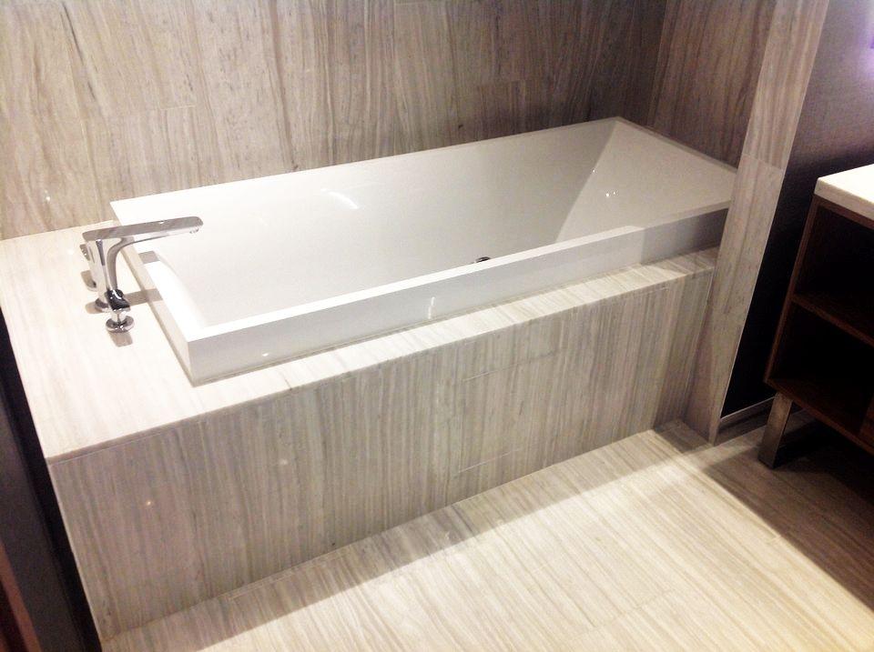 Им облицованы пол и стены, а также прямоугольный постамент, в который заключена ванна. Из этого же камня изготовлена столешница.