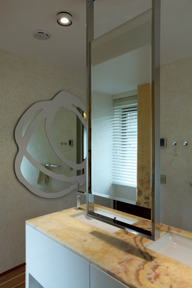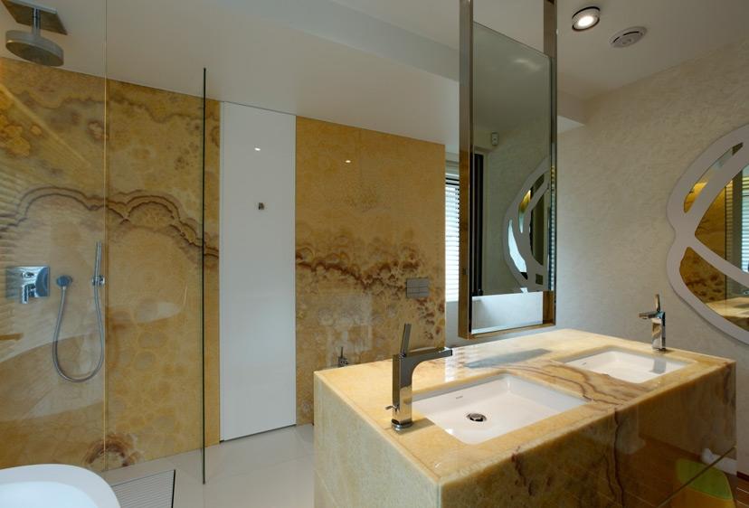В данном проекте задействованы плиты нежно-желтого Onyx Nuvolato с узорчатым рисунком. Им облицована тумба со столешницей под мойки. При раскладке плит для изделия дизайнер старался сохранить цельность природного рисунка.