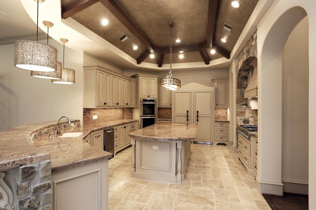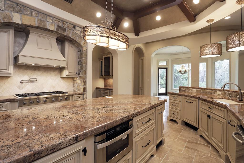 Гранит African Ivory отлично гармонирует и с материалом пола - Travertine Cream. Нежно-бежевый травертин с лощеной фактурой также слагает и фартук у кухонной плиты.