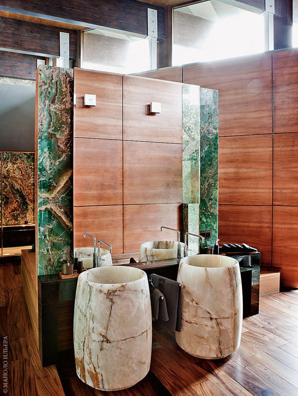 Элементы стен в гостиной и ванной комнатах выполнены из ярко-зеленого мраморного оникса Onyx Smeraldo. А высокие напольные раковины-вазоны — из нежно-салатового Pakistan Green.