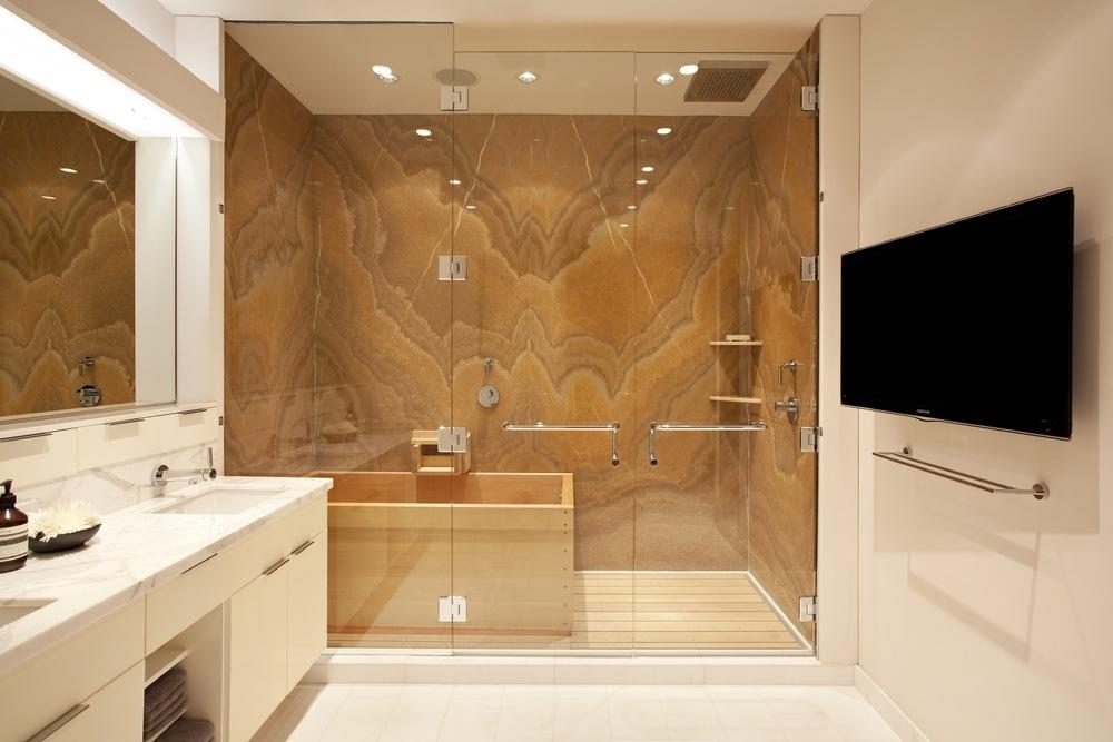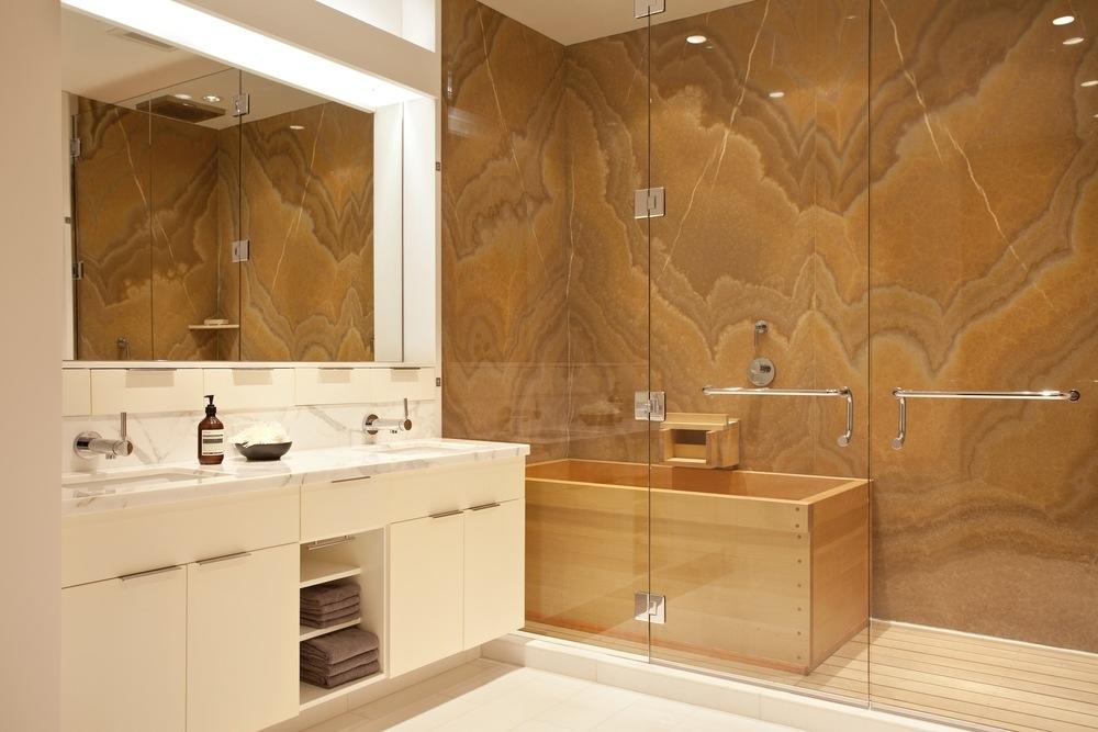 Для отделки ванной комнаты дизайнер решил использовать продолговатые слэбы мраморного оникса Onyx Arco Iris. Слэбы сложены таким образом, что образовался симметричный рисунок. Такая раскладка носит название "бабочка", она требует прямого заказа каменного материала с месторождения - слэбов, распиленных от единого блока породы.