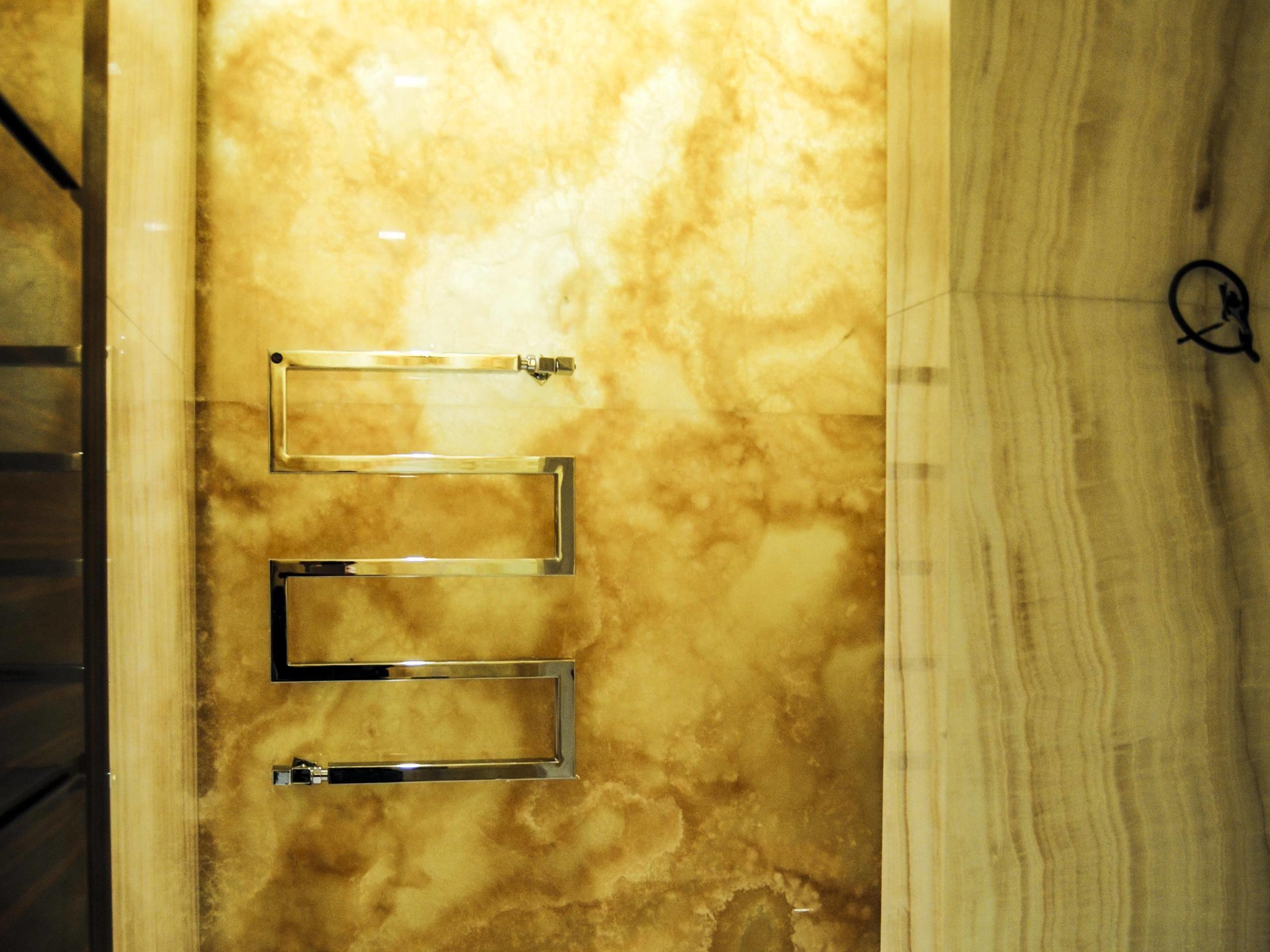 Ванная комната облицована крупными плитами и полуслэбами мраморного оникса двух сортов: Ivory и Honey.