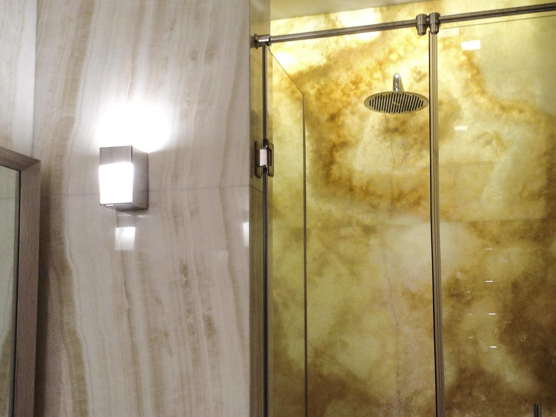 Полосатый оникс Ivory в распиловке Vein Cut использован для отделки стен ванной, а Onyx Honey с узорчатым рисунком - слагает стену душевой кабины. Душевая оборудована внутренней подсветкой стен. Свет, проходящий через слэб оникса, приобретает приглушенный и мягкий оттенок, создавая в ванной необыкновенную атмосферу.