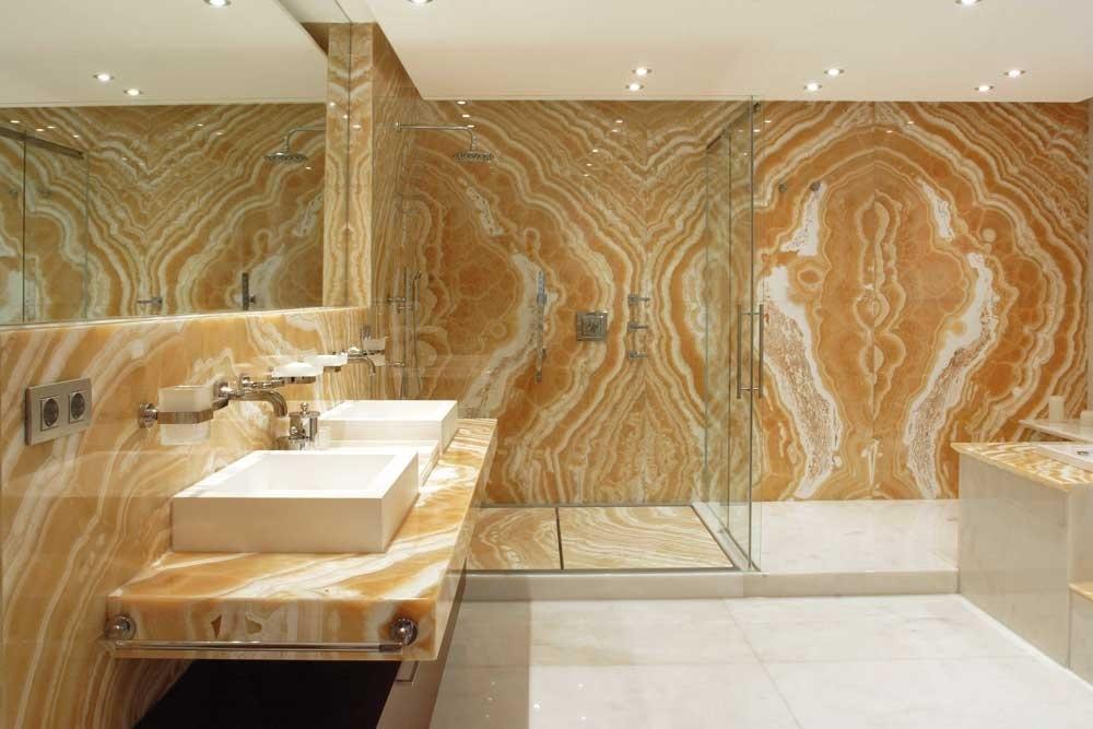 Onyx Alabastro играет главную роль в интерьере этой роскошной ванной комнаты. Им облицованы все стены и пол в душевой кабине. Из него выполнены столешницы и элементы мебели. Солнечный и нежный свет этого камня вносит динамику и заряжает положительной энергетикой.
